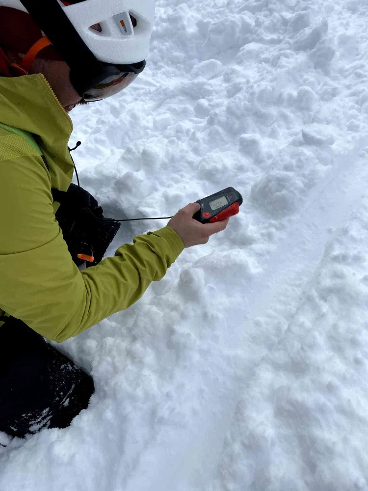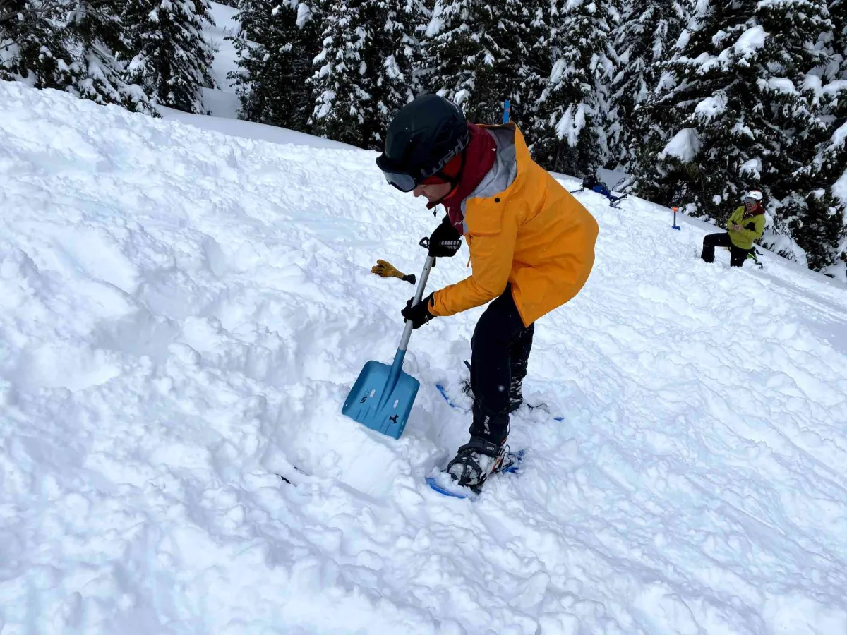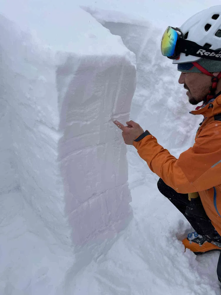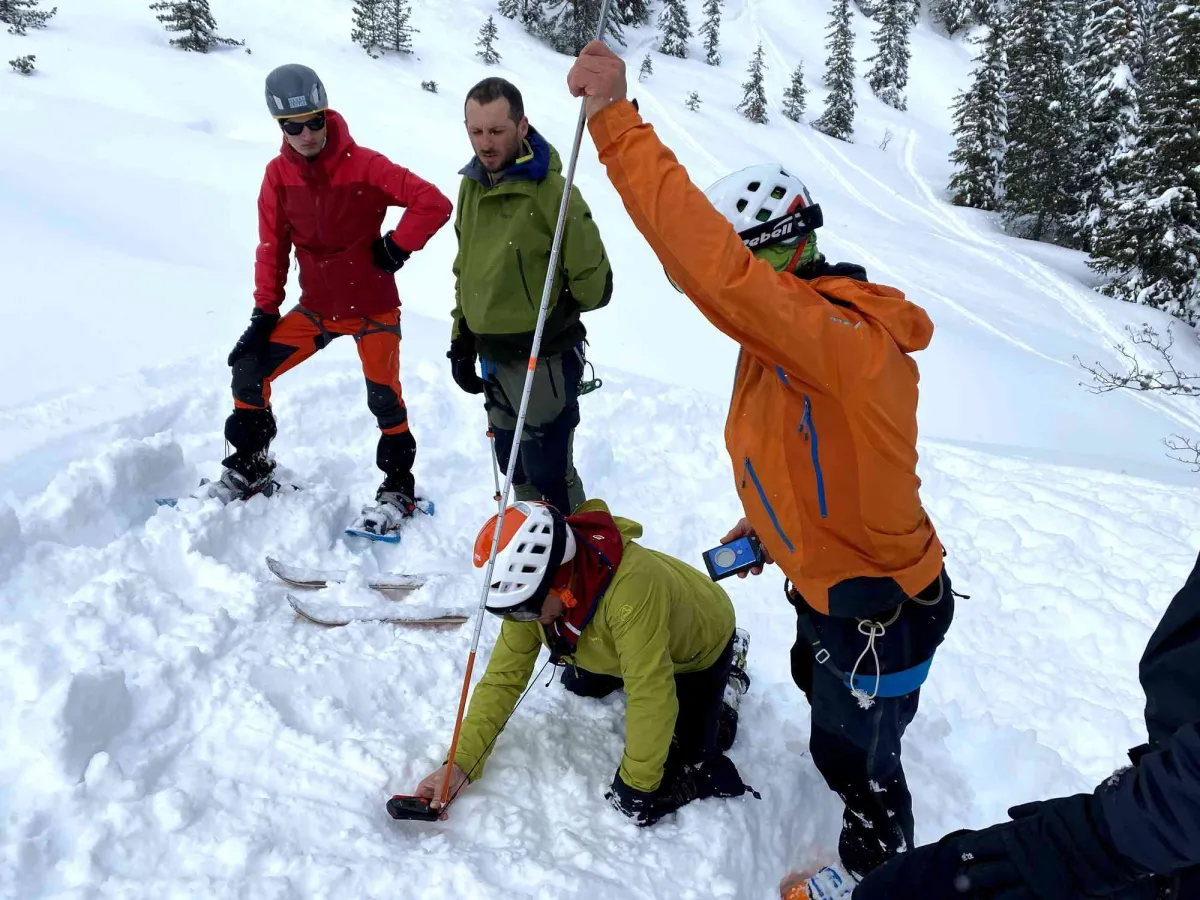 Duminică, înainte de coborârea înspre Cârnic, Aurel ne-a prezentat tehnica citirii zăpezii facând încă un profil în zăpadă. Mai apoi, fiecare pe rând am simulat căutarea de victime multiple surprinse de avalanșă.
