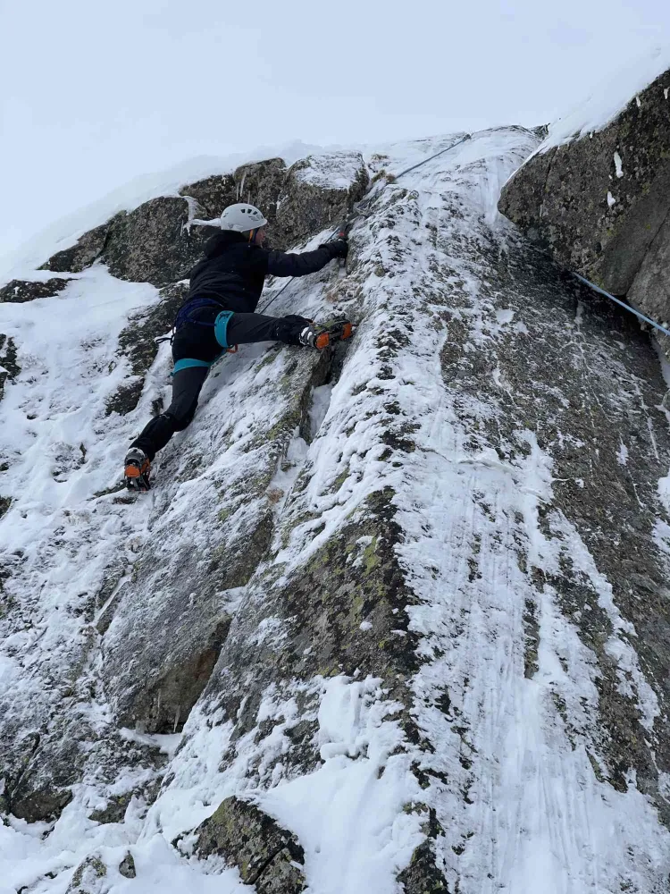 În prima zi am făcut un profil pentru citirea zăpezii, am recapitulat nodurile de bază, am simulat regrupări la baza versantului estic al Culmii Stanișoarei unde mai apoi, Aurel a amenajat două manșe pe care ne-am familiarizat cu tehnica de cățărare mixtă.