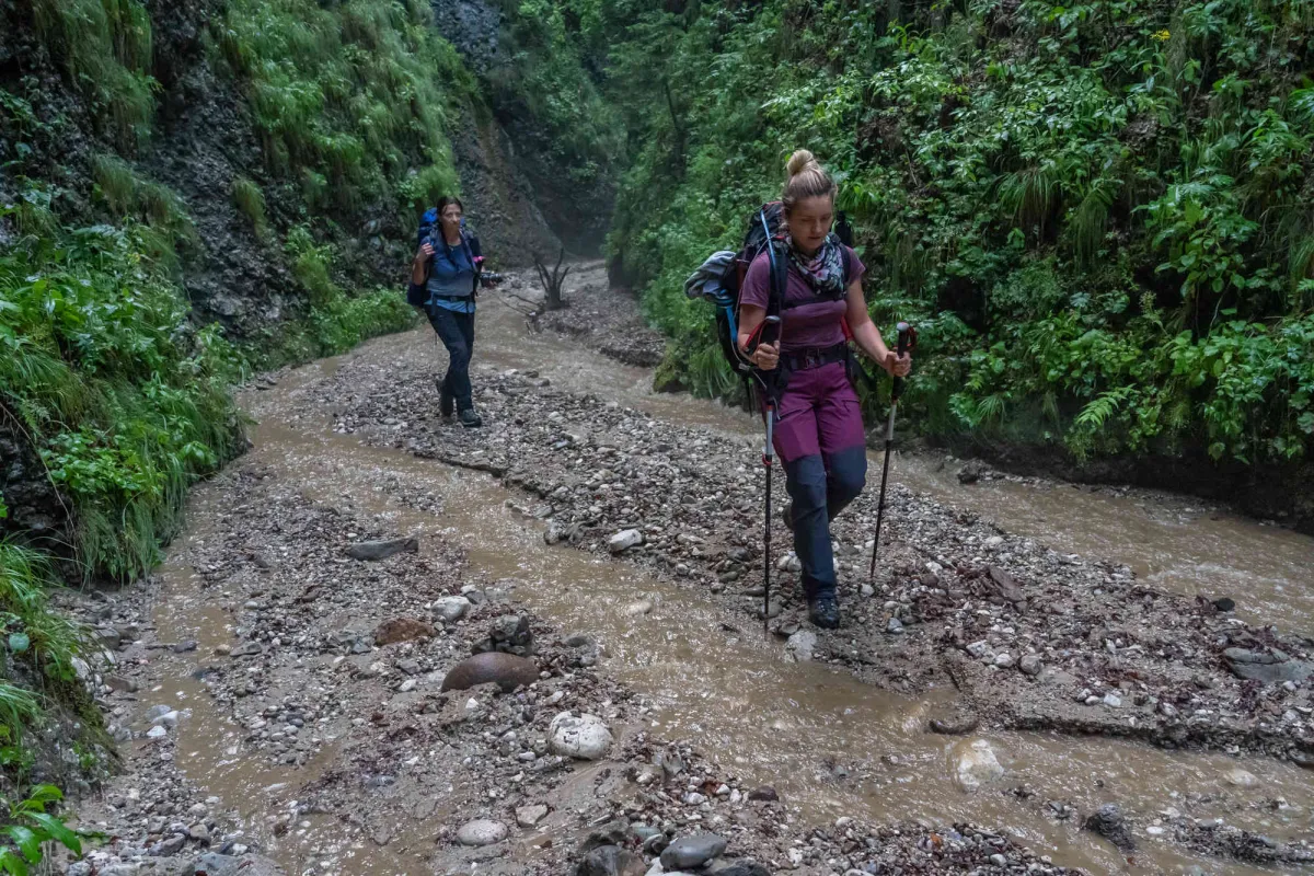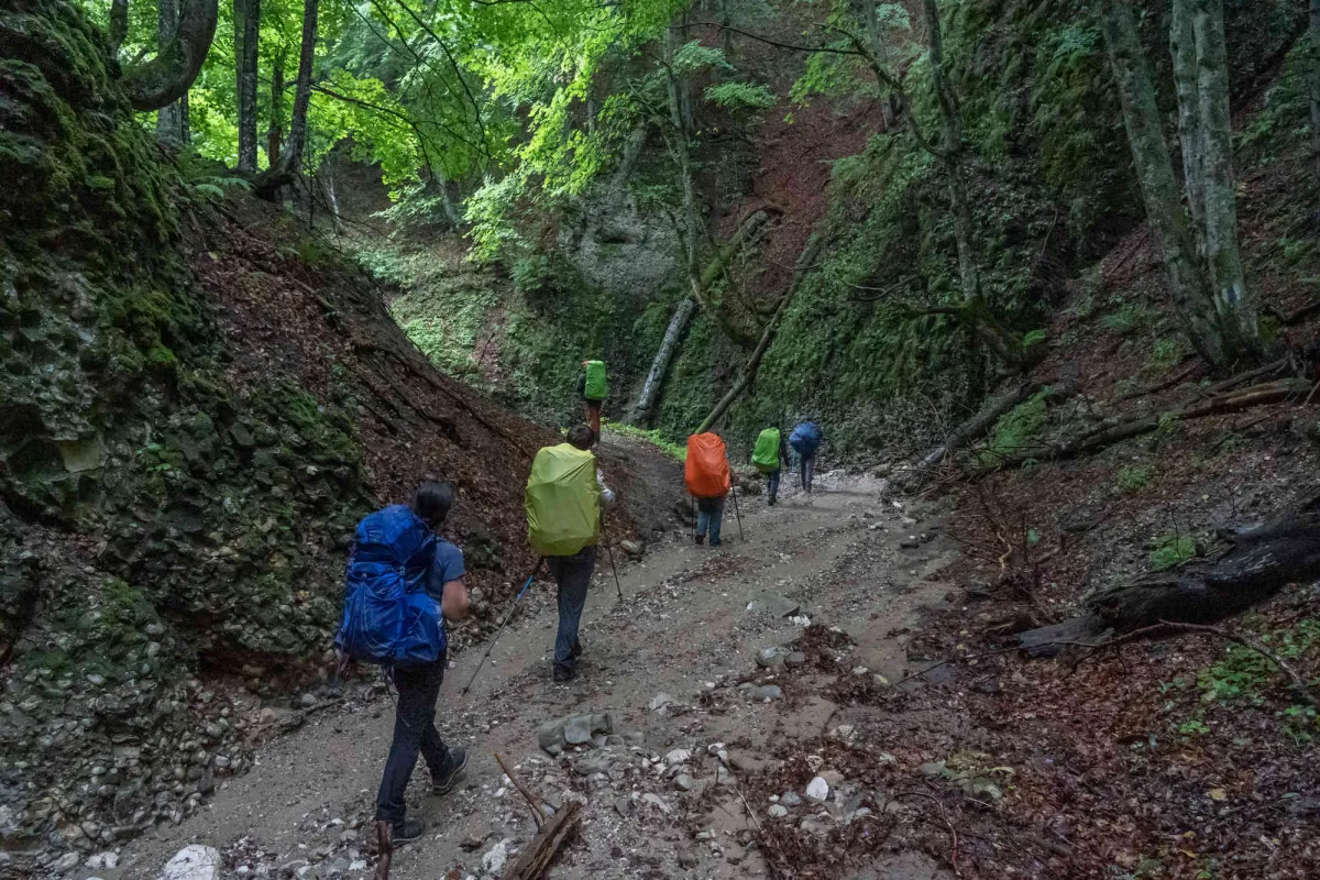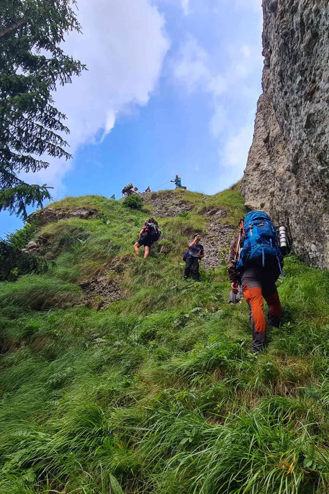 Sâmbătă dimineața abordam prima zi care avea în plan urcarea abruptului vestic format de culmea Zăganu-Gropșoarele. Urcăm în prima parte a zilei Piscul Gropșoarele și Coama Scurtă, porțiune în care am urcat numeroase țancuri și tunuri, majoritatea la liber fără asigurare. În zonele expuse și periculoase au fost asigurati totuși participanții pentru a parcurge confortabil toate porțiunile de traseu obligatorii, având posibilitatea de a urca și altele opționale. Pe la amiază apar primele amenințări de ploaie astfel că sărim peste pauza de masă și grăbim pasul pe una dintre culmile estice care se desprind din Șaua La Răscuce până la stâna dezafectată de pe Valea Stânii. Ajungem la stână la ora 14:00 iar după circa 10 minute vine prompt și ploaia care o așteptam conform radarului meteo. Ne “cazăm” în stâna părăsită circa 3 ore, timp în care avem mai multe reprize de ploi sănătoase de vară, timp în care servim masa iar o parte dintre noi se bucură de un somnic de amiaz, mai ales Alex și Crina, care au sosit abia pe la 4 dimineața în punctul de întâlnire din Poiana Gropșoarele, urmare a unor aventuri urbane. Pe la ora 17 după ce revine vremea bună ieșim din stână și continuăm traseul pe care il aveam planificat, coborâm prin Cheile Văii Stânii până în Poaina Stânii unde ne facem tabăra pentru a doua noapte. În această primă zi am parcurs 13,2 km cu o diferență pozitivă de nivel de 1.147 m. Pare puțin însă suficient pentru noi întrucât am avut porțiuni dificile și trepte de cățărat cu bagajul mare.
