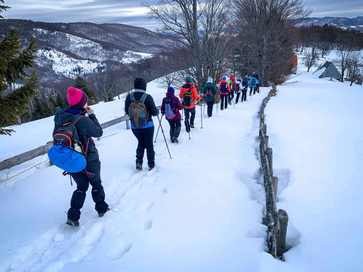 După o scurtă introducere și prezentare, grupul nostru entuziast începe ascensiunea pe drumurile care se înalță printre vechi sălașe moțești. Ne însoțește o ploaie măruntă, ce ne stropește acompaniată de raze timide de soare. Zăpada este și ea prezentă în peisaj, ceea ce face ca acest fenomen de ploaie cu soare să fie și mai straniu. Nu ne lăsăm descurajați de condițiile meteo și continuăm să deslușim labirintul drumurilor înșirate printre gardurile de lemn ale sălașelor.