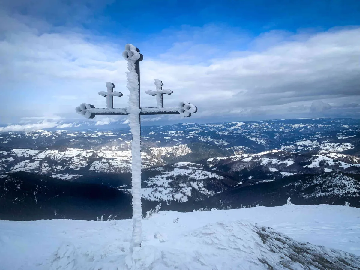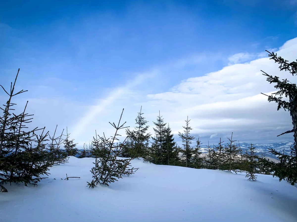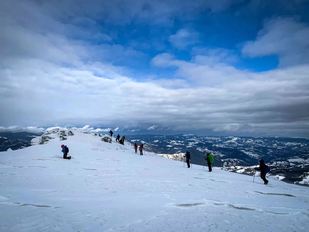 În cele 8 ore de drumeție am experimentat multiple fenomene meteo, de la ploaia cu soare care ne-a însoțit la începutul zilei, la vântul năprasnic din zona vârfului. Am zărit mai multe curcubee și ne-am croit poteca prin zăpadă în locurile unde nu am beneficiat de drumul tasat de un vehicul șenilat ce trecuse recent prin zonă. A fost o incursiune veritabilă de iarnă, cu inserții de primăvară și toamnă, ce a presărat amintiri frumoase și satisfacție în rândurile participanților.