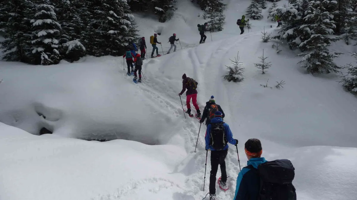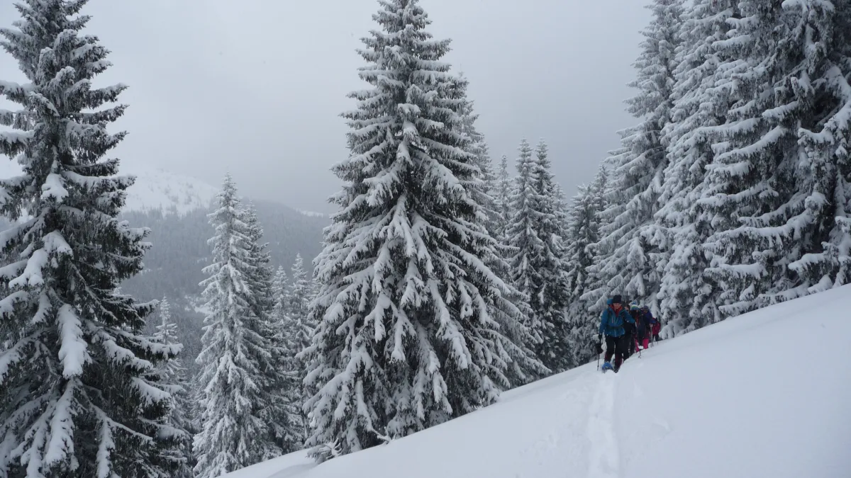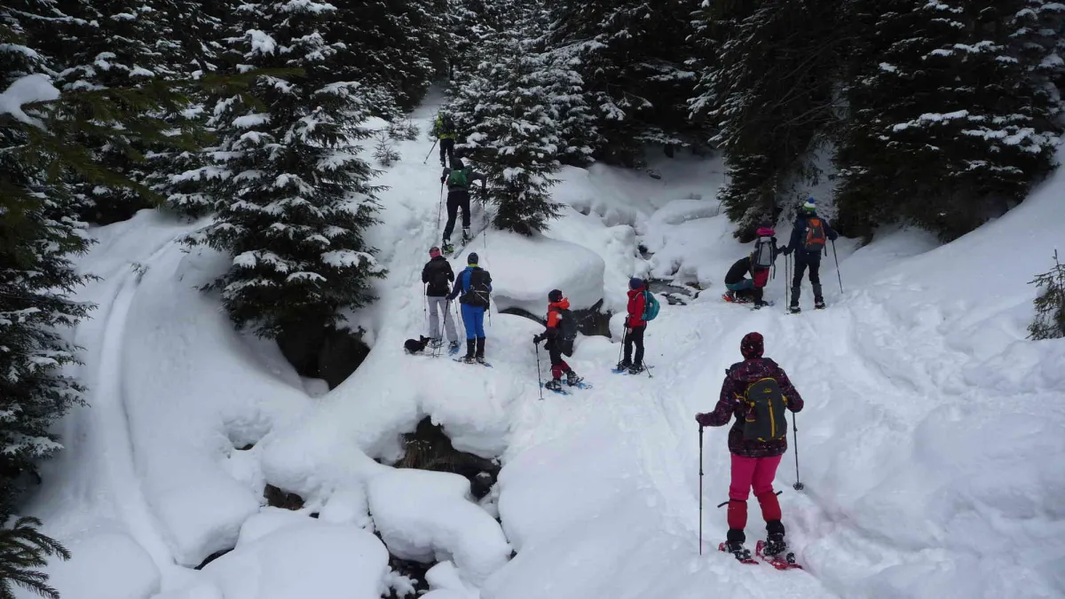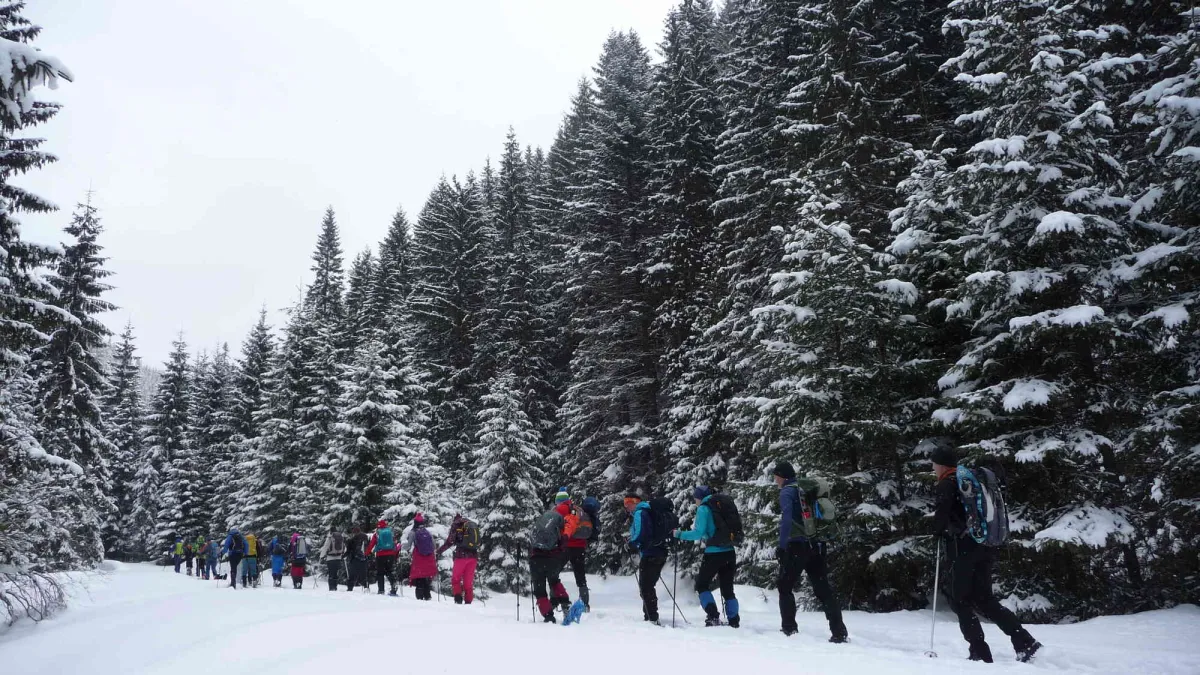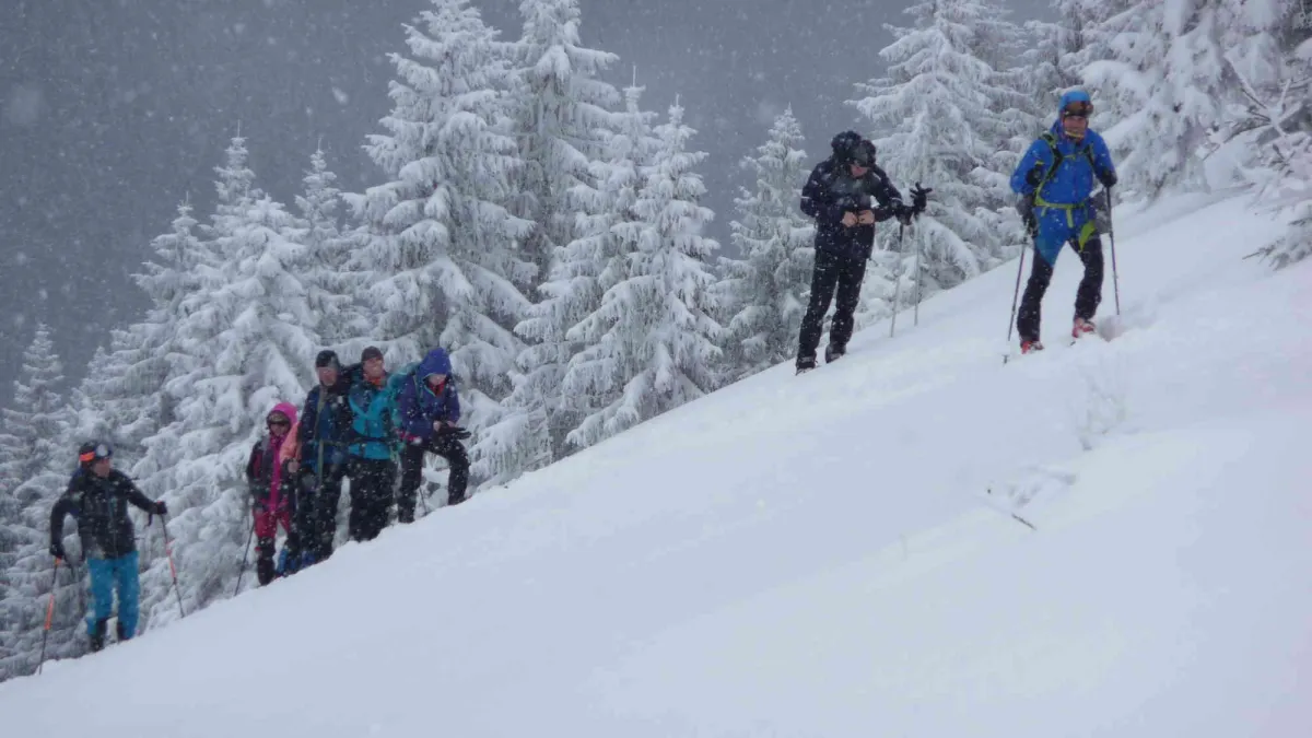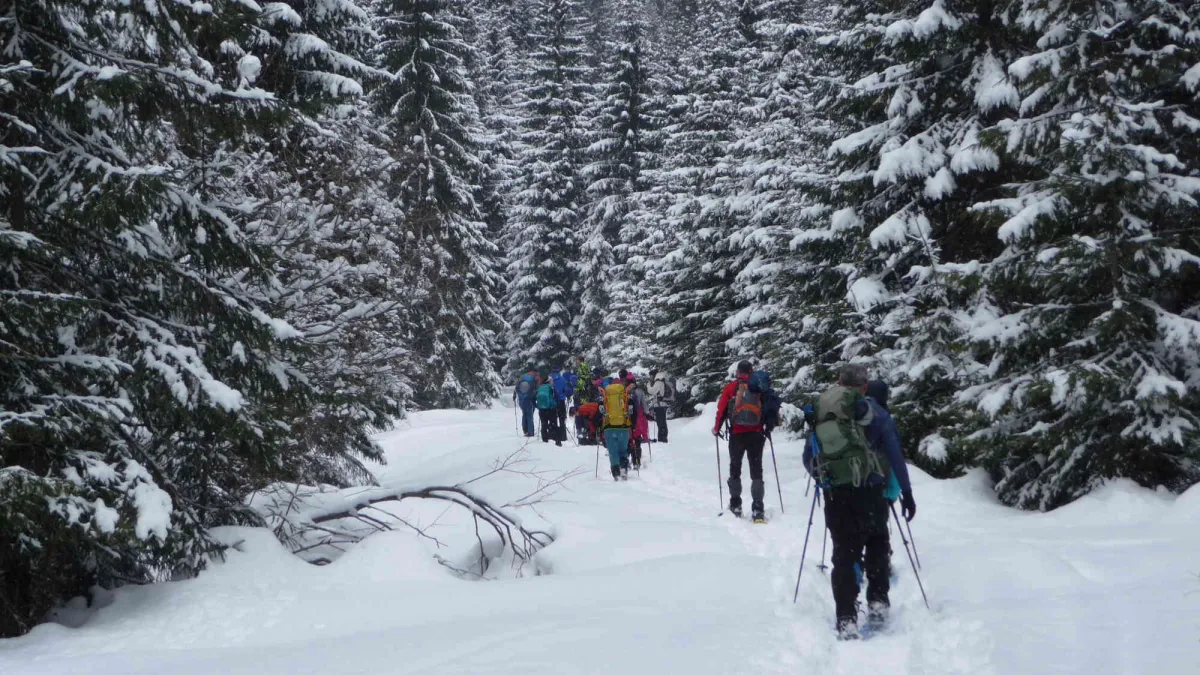 Mai bine de 4 km poteca a fost lină, în mare parte pe un drum forestier înzăpezit, ce semăna mai mult cu o cărare prin pădure. Fiind o potecă lină, „plămânii” ne-au lăsat să povestim între noi (n-am gâfâit prea tare), iar rachetele de zăpadă și schiurile de tură au fost salvatoare, am umblat pe (apă) zăpadă- pentru unii dintre noi a fost un exercițiu benefic de introversie.