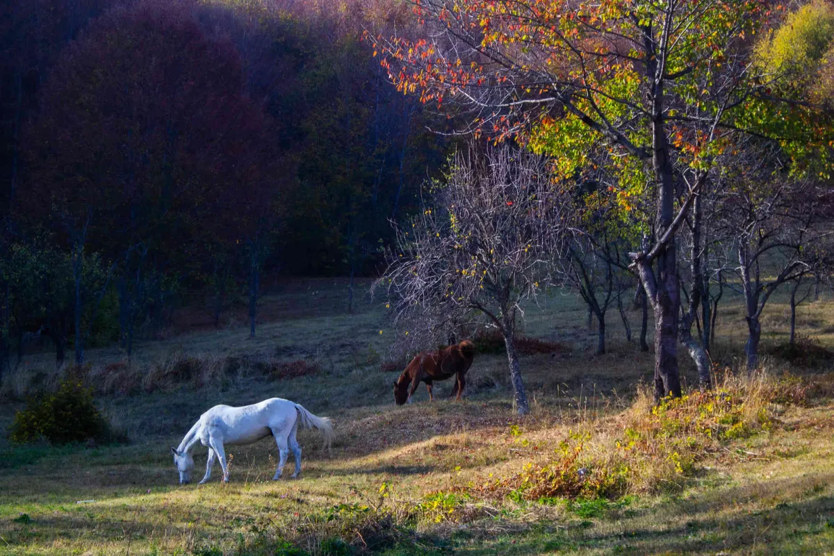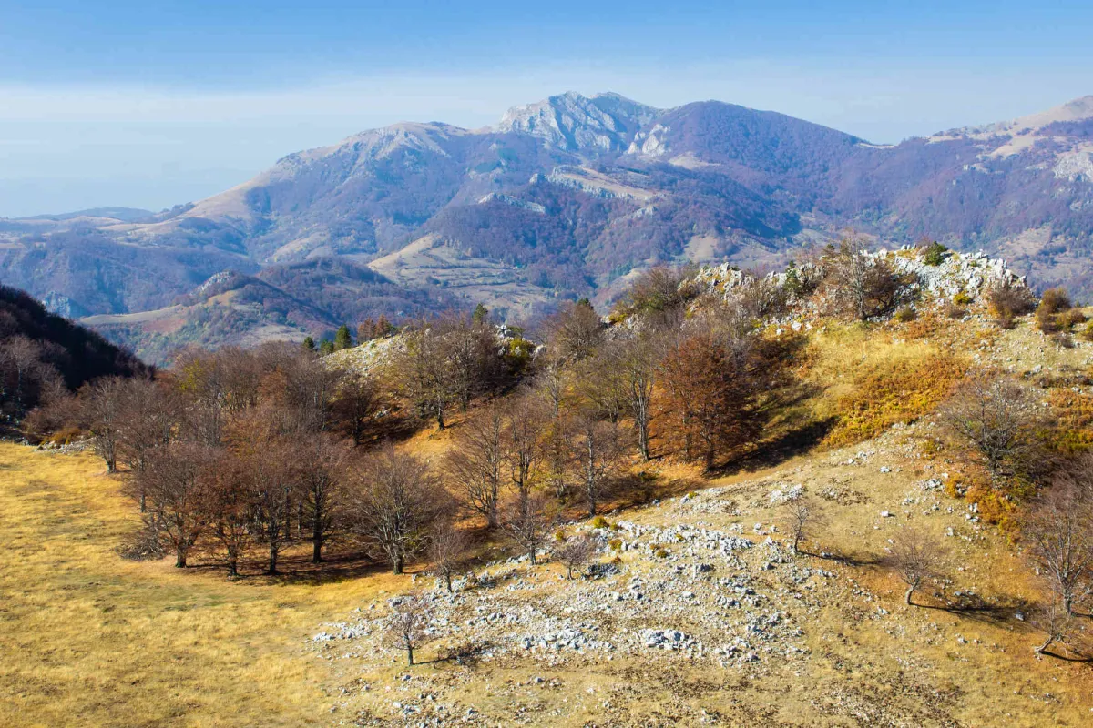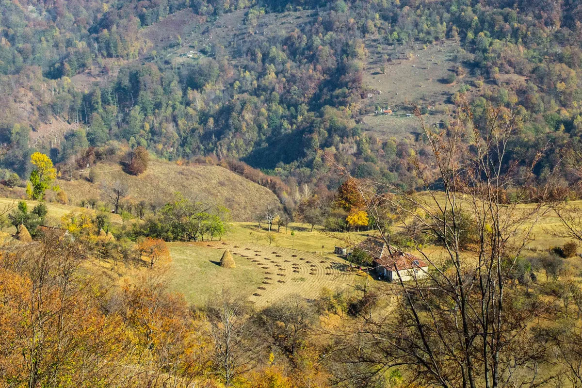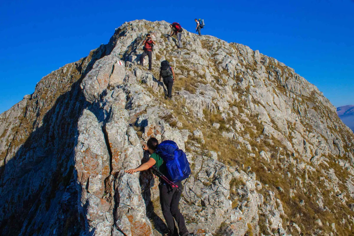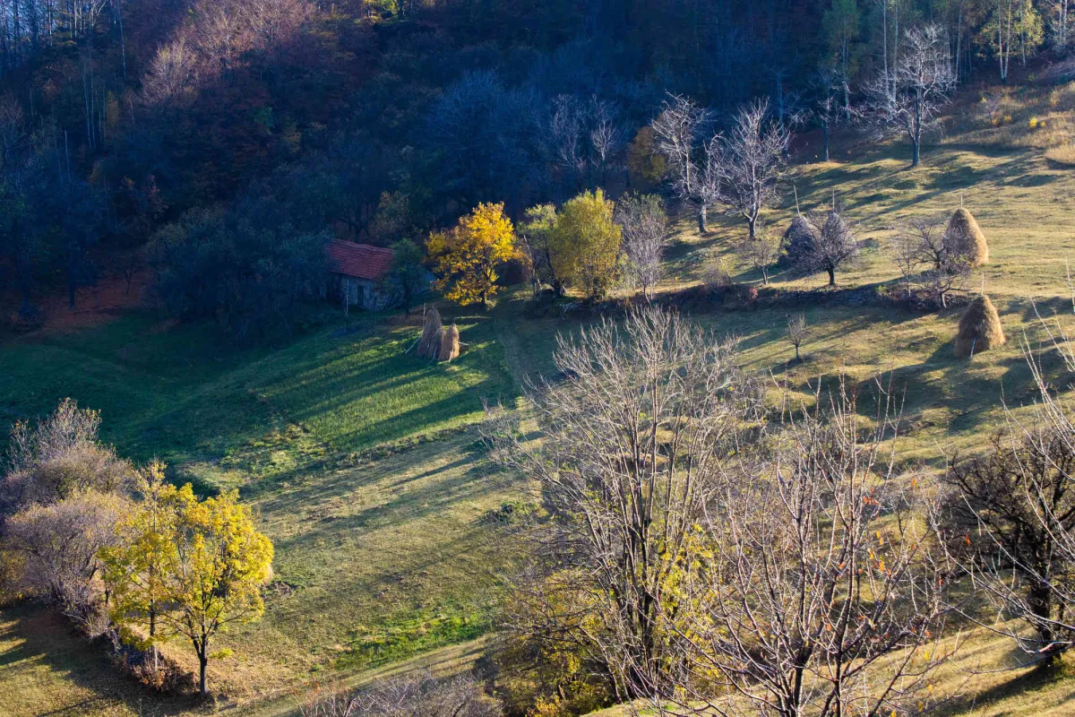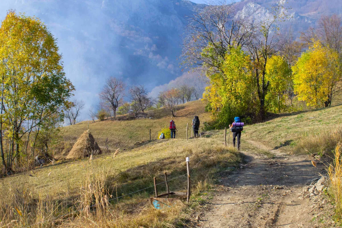 Cheile Prisăcinei pot fi abordate în două moduri, fie prin apă în acest caz fiind indicat inclusiv echipament de cățărat la purtător fie parțial pe firul apei și după pe o porțiune ocolitoare prin stânga abruptului cu vedere permanentă asupra cheilor, apoi revenire în zona morilor de apă și vâltorii. Noi am abordat varianta potrivită anotimpului și bagajului, am parcurs o primă porțiune pe firul apei urmat de urcarea pe peretele vestic. Cheile Prisăcinei le-am găsit sălbatice și spectaculoase ca de obicei, cu un plus de culoare datorat anotimpului. După chei ajungem pe unul dintre vechile drumuri de căruța care lega Cracu Mare de Prisăcina pe valea Prisăcinei. În prezent acestea sunt trecute doar pe jos întrucât exista noi drumuri „de buldozer” mai accesibile inclusiv cu mașini 4x4. În Prisăcina facem o pauză de masă apoi traversăm cătunele alpine pitorești Dobraia si Bedina. Școala din Dobraia o găsim reabilitată recent și dotată cu panouri solare. O plăcuta surpriză a zilei a fost izvorul din Poiana Lungă, care contrar așteptărilor se încăpățâna să mai curgă ușurel. Prezența apei și vremea foarte bună fara vânt ne invită să dormim în creastă într-un loc aflat pe lista de dorințe a câtorva dintre noi, astfel că ne alegem un loc deosebit de cort cu vedere incredibilă atât asupra apusului cât și a răsăritului, la circa 1.350 m altitudine după Vf. Biliana sub colții Zascol, Arjana. Aici am primit un cadou colorat parcă în ton cu toamna, culori și saturație parcă mai intense fată de cele avute acest an pe alte vârfuri și culmi. Am fost copleșiți de apus, parcă interminabil dar mai ales de răsărit care ne-a vrăjit și imobilizat, am rămas hipnotici, astfel că plecarea în ultima zi a fost la lumina zilei, ușurel după ce ne-am ghiftuit cu frumusețe. În această zi am parcurs circa 19 km cu o diferentă pozitivă de nivel de 2.300 m.