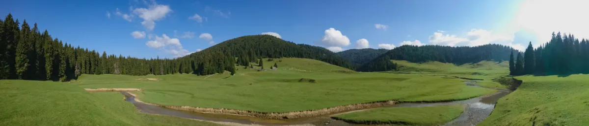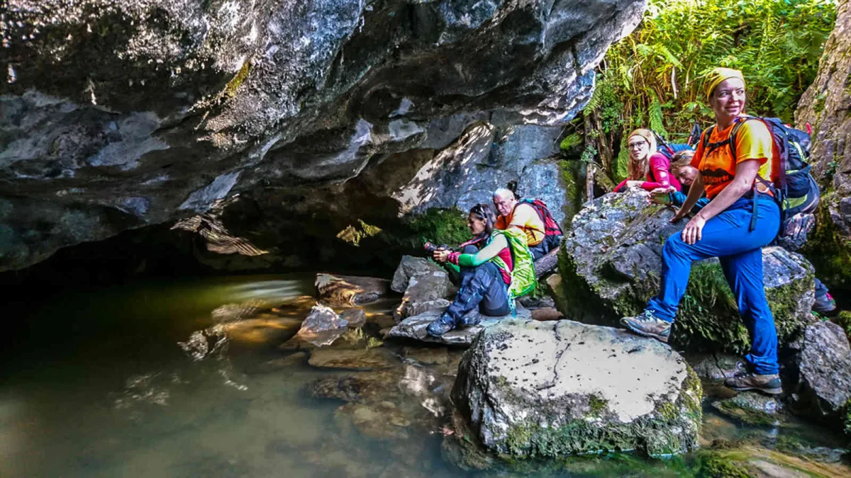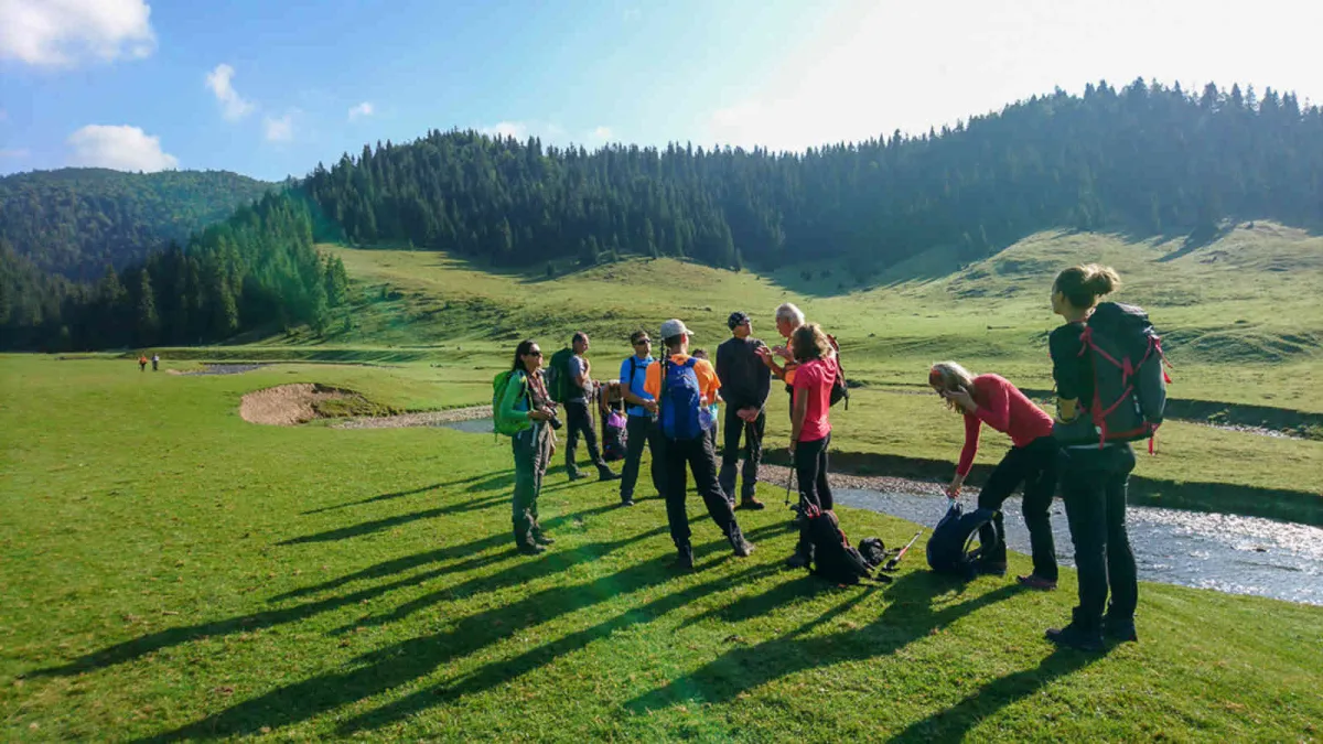 Duminică dimineața ne-au trezit voioasele păsărele din jurul cabanei, deci clar era senin. Și liniste. Afara, in curtea cabanei, era frumos amplasata o terasa cu scaune si mese de lemn rustice pe care le-am admirat cu toții. Dupa micul dejun si un ceai aromat, ne-am deplasat cu mașinile până la Glăvoi și apoi ne-am îndreptat per pedes spre Poiana Ponor, o poiană întinsă și verde , împrejmuită de culmi partial împădurite. Marlene ne-a condus spre Izbucul Ponor – o altă minunăție a naturii.