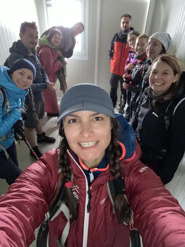 Ne-am adapostit de vant usor sub varf si am luat pranzul binemeritat. Dupa cateva poze in ceata si frigul de pe varf ne-am incalzit in refugiul din apropierea varfului si ne-am continuat drumul cu intoarcea pe banda rosie, insa cu oprire pe Varful Carja (2405 m) si Varful Parangul Mic (2074 m).