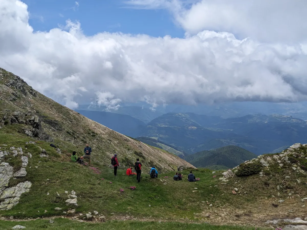 Sambata dimineata ne-am reunit cu totii in statiune la baza traseului si am luat-o usurel “la deal” pe traseul marcat cu banda rosie spre Varful Parangul Mare. Ceata ne-a insotit o mare parte din traseu. Prima oprire pentru cativa dintre noi a fost pe Varful Gemanarea (2437 m), ceilalti au ales sa mearga pe la baza lui, iar aprox 30 min mai tarziu am ajuns pe Varful Parangul Mare (2519 m).