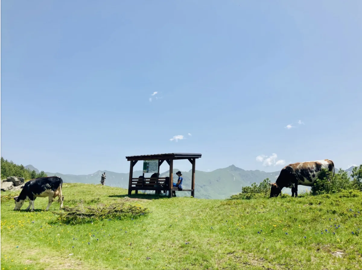 La ora 12:00 ajungem pasul Aljuci, la 1916 m si vedem in vale unde trebuie sa ajungem la Dobërdol. Ne intalnim cu fetele din Berlin de la cazarea de ieri si doua vaci pe care Oana incearca sa le mulga, fara succes. Alex si Luci isi cumpara cu 3 euro Iaurt si burek de la cafeneaua din pas. Oana si Vlad fac o cafea si mananca sandvish-urile facute la Cerem. Luci mai face o supa de mazare galbena din Ukraina cu alte condimente si Alex face o cafea la ibric. Stam o ora si pornim la vale.