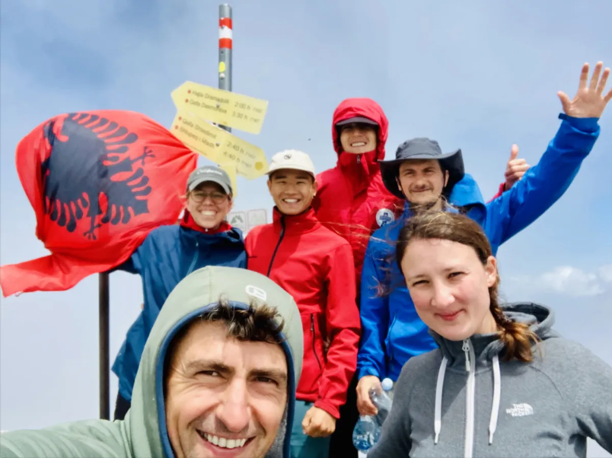 Ajungem pe platou la Qafa Gjonit(1805m) dupa 1:34:28, 3.73 km. Norii se spart si vedem in vale, ploaia s-a oprit si facem un popas la foisor. Mergem putin mai sus la o casa abandonata sa ne lasam rucsacii si gasim inauntru un tanar din Carolina, Whitecliff. Pornim fara bagaj spre varf. Ajungem la 1955m, varful Majla (2403m) este in nori, dar noi continuam urcarea. La 11:45 ajungem pe varf dupa 1:14:35 de la platou. Facem o fotografie impreuna, scriem in Jurnalul din cutia metalica.