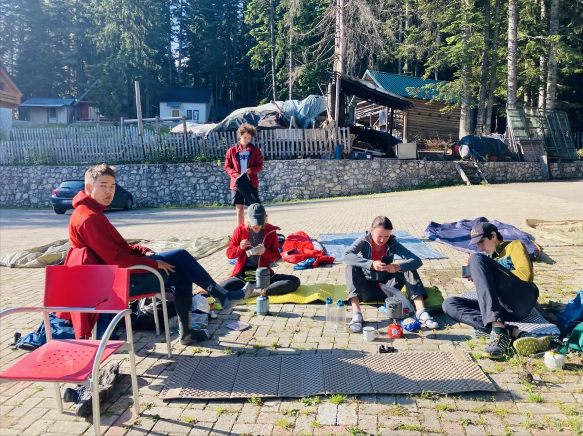 Urcam la drumul principal care ne poarta pasi spre cazare. Gazda noastra ne primeste calduros si aflam ca este fiica gazdelor si Plav, din prima seara. Baiatul ei il ajuta pe Vlad sa monteze cortul. Alice, Loti, Alex si Luci ajung la 17:35 si se instaleaza la cort si in camera. Loti, Luci, Whitecliff si Vlad fac streching pe terasa cu privelistea spre varful Bandera od Starca(2426m). Mancam impreuna cina, putina moncher pentru 10 euro. Luci si Oana merg pe deal sa prinda semnal.