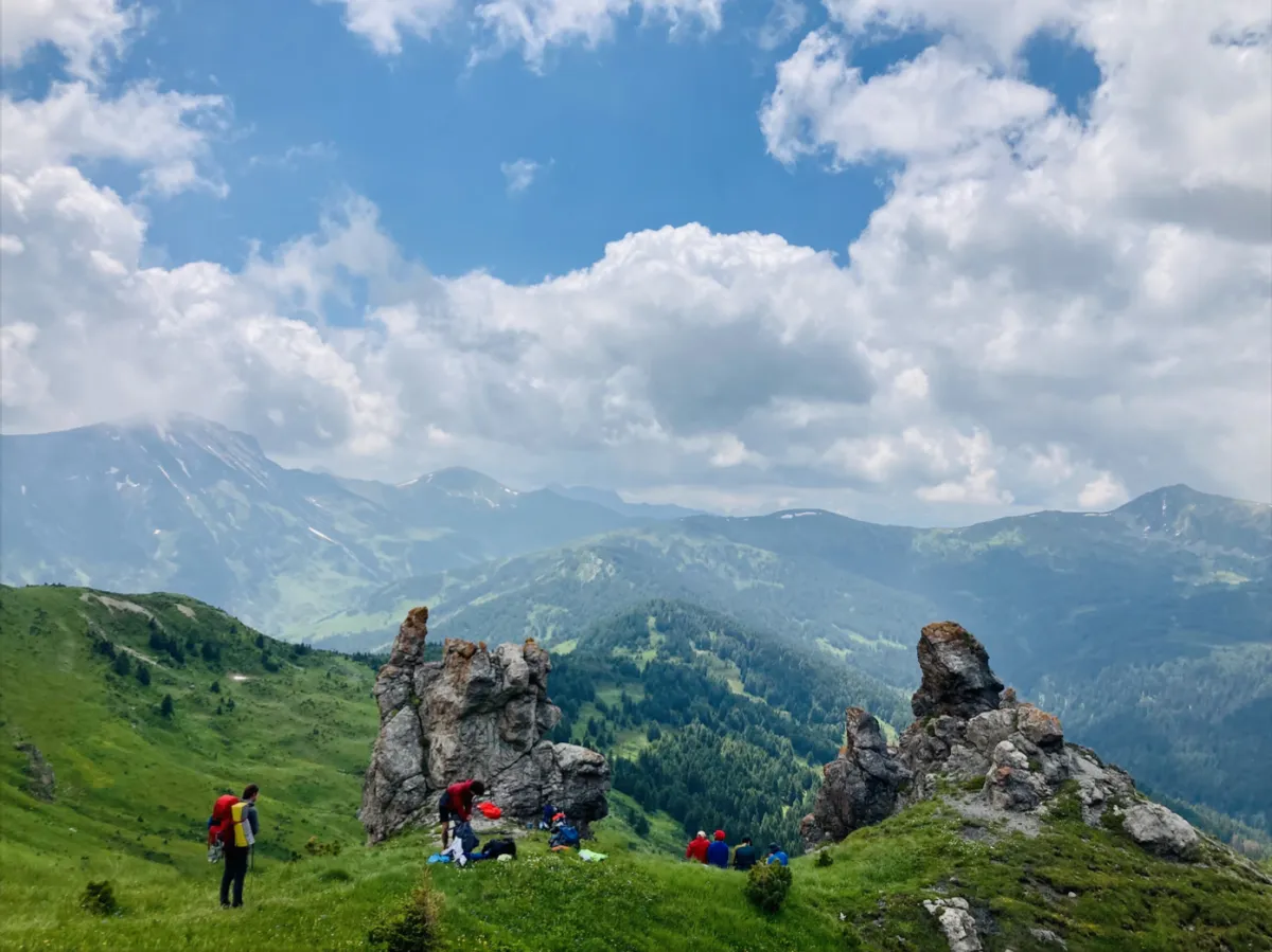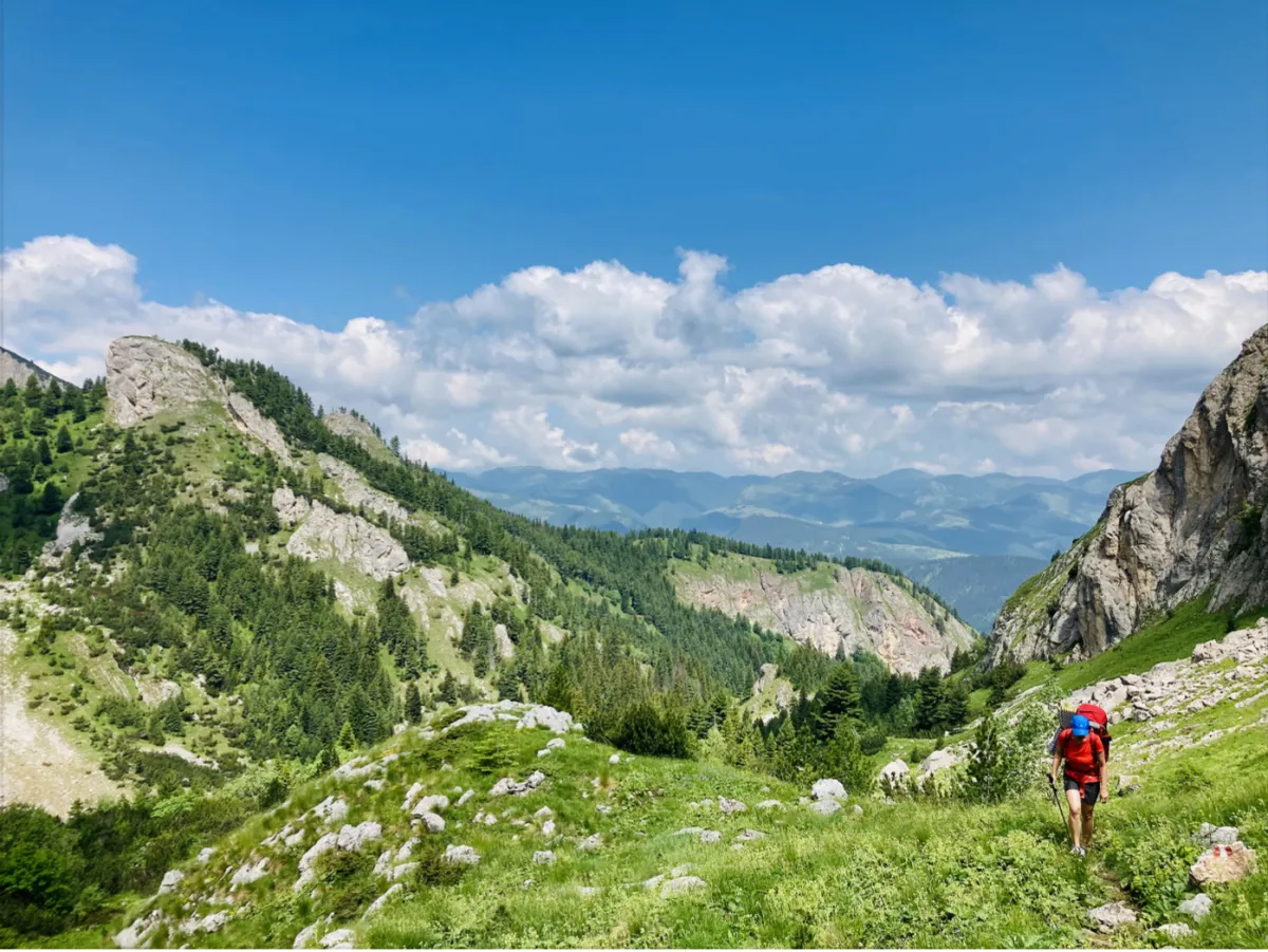 Oana si Vlad stau la picnic si vad un pui de capra neagra care coboara pe langa ei in vale. La 2269m ne regrupam la doua stanci si continuam toti noua pe curba de nivel. Privelistea este superba si varful Bogdas(2533m) din fata noastra este acoperit din cand in cand de nori. Cantecul pasarilor sparg linistea muntelui. Poteca merge pe linia granitei dintre Kosovo si Muntenegru, si vedem traseul pe care am venit acum doua zile. Dam de Lacul Pusi i Roshkodolit (2035m) si continuam printr-o padure de conifere, miroase asa bine a pin.