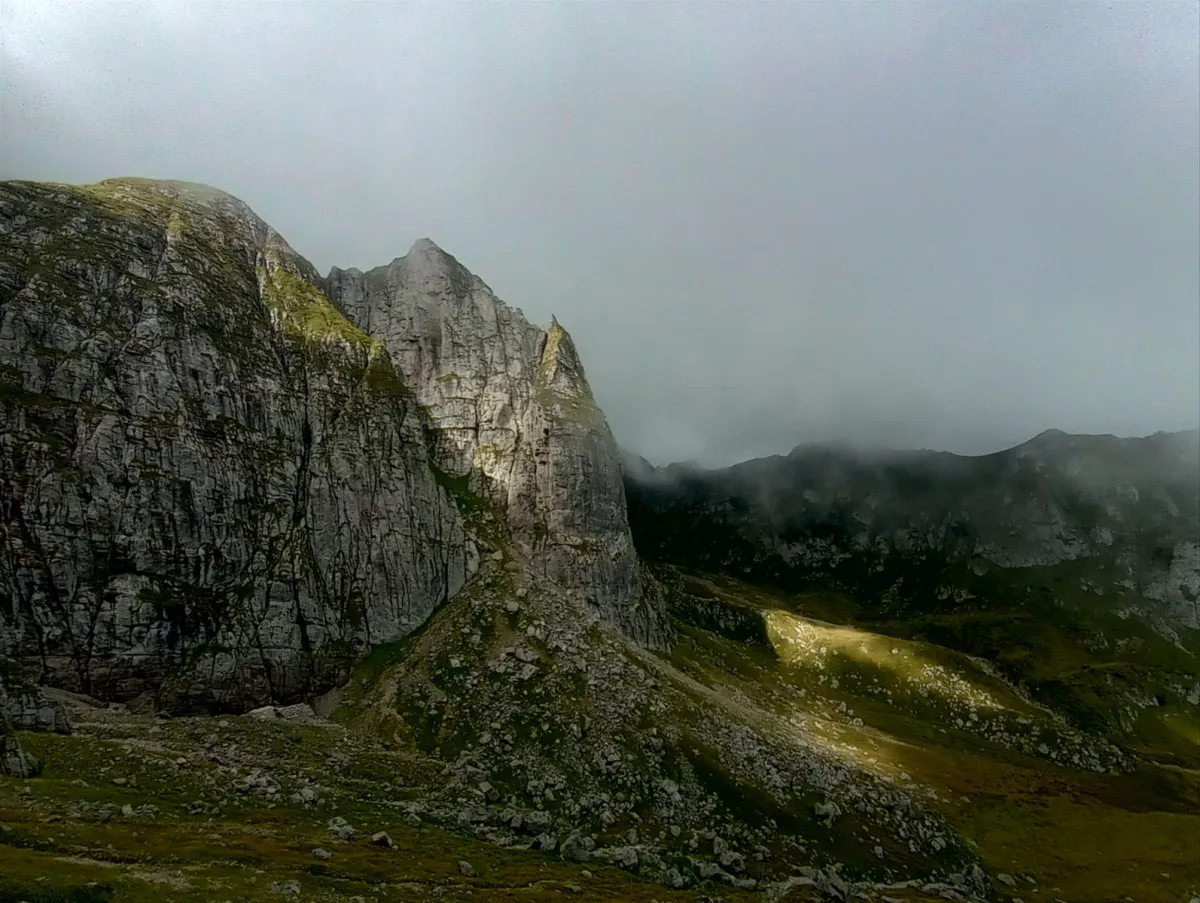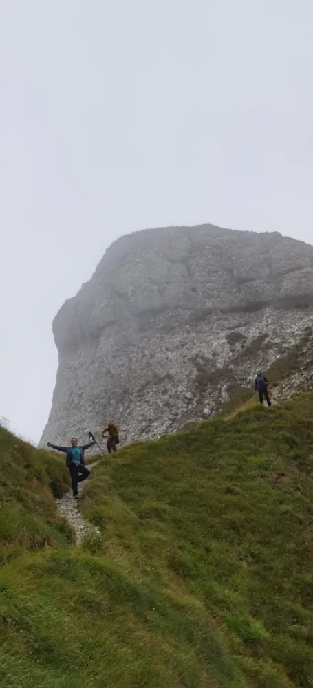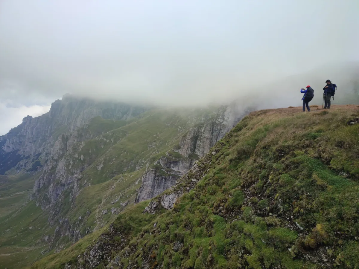 A doua zi pornim la 9.30 la drum, mai târziu decât ieri. Pornim pe planul inițial, cu gând de a lungi tura dacă permite vremea. Într-o jumătate de oră suntem în căldarea 2 la schimbarea marcajului în TA. Și unde e brâna? Tocmai acolo, sus? Urcăm ușor prin căldare și apoi, trecând de hornul cu lanț, ne angajăm în serpentinele destul de strânse care ne duc la începutul brânei. Energia ne cheamă în sus ”pe brânele Bucșoiului”. Regrupăm și merg înainte, mereu cu grijă să am vizibilitate spre toți membri grupului. Avem noroc cu vremea. Brâna e exact sub marea de nori care ne alintă ba cu vederi în față sau în jos spre vale, ba cu valuri de nori. La ieșirea din Brână în BR intrăm definitiv în nori. Asta face să pierdem puțin marcajele pe o potecă ce pare mai lină și revenim pe trepte înierbate la marcaj. Pauză de energizare, fiecare unde găsește ceva protecție la vânt și continuăm până pe vf. Bucșoiu Mare, cu o pauză de regrupare chiar înainte de vârf. Poză de vârf și coborâm în Șaua Bucșoiului unde e o turmă mare cu cioban și câini liniștiți. Începem ultima urcare prin alte serpentine și ne întâlnim cu alergătorii care ne depășiseră la pauză. La ora 13.00 suntem la Omu și e mult mai aglomerație decât ieri. Nah, e sâmbătă și vreme acceptabilă pe platou, doar mai sus de Cerdac apăruseră norii. Întâlniri faine cu colegi și prieteni de munte printre care neobositul Dan Vasilescu într-o tură omagială! Abia găsim loc de un ceai și ceva masă frugală pe banca din fața cabanei. Giulia și Cosmin iau decizia de a coborî pe Drumul de Vară după un dus-întors pe Bucura Dumbravă. Pentru Giulia coborârea ce urmează este prea mult pentru genunchi și admir decizia ei foarte corectă. Noi trecem de Capul Morarului și încercăm o coborâre în Valea Morarului. Dar fiind alb total și vânt, renunțăm la idee și ne întoarcem la traseul inițial. În Șaua Bucșoiului ne răzgândim fiindcă se vede, sub marea de nori, imensa căldare superioară a Văii Morarului. E un plus fain față de planul inițial. Parcă ar fi nevoie și de ceva nemarcat :D! Coborâm în căldare și regrupăm înainte de pragul de sub căldare unde știam că este un lanț. Se dovedește a fi o coborâre ușoară și apoi până la al doilea prag urmăm o potecă cu momâi, alta decât ce știam eu din alte ture. Avem și o surpriză: un buchet de flori de colț chiar lângă potecă! Coborâm în a doua căldare pe care o parcurgem minunați de frumusețea locurilor. Urmează coborârea în canion unde avem surpriza a alte două lanțuri și apoi coborârea pe versantul drept prin rugi de mure și tufe de zmeură. Mi se cere o pauză și spun că o fac după zona cu zmeură. Totuși ne vom opri tot între tufe de zmeură pentru domolirea poftei. Se ușurează panta, trecem de intrarea/ieșirea sălbatică din Bucșoiu Mic și ieșim la marcajul TR. De aici ne vor însoți patru câini cuminți până la Pichetul Roșu și vor pleca cu alt grup spre Poiana Izvoarelor. Noi facem stânga pe poteca numită Tache Ionescu, într-o jumătate de oră suntem la banca din firul văii Bucșoiului, apoi continuăm în urcare până la zona de belvedere, trecem de poteca marcată cu BR care vine de pe Bucșoiu (planul inițial), apoi de podețul recent reamenajat și urcăm susținut pe vâlcelul ce se termină la masa de unde se văd cabanele Diham și Mălăiești. Începe să se audă muzica de la festival. Coborâm un pic mai repede și la 19.20 suntem la Mălăiești la o ciorbiță caldă și câteva ceaiuri. Teoretic la 19.30 se închide bucătăria! Tura se termină cu a doua seară de festival, cu prietenii de la Calendar cu cel mai lung ”recital” și alții prieteni urcați pe scenă după dorința inimii.