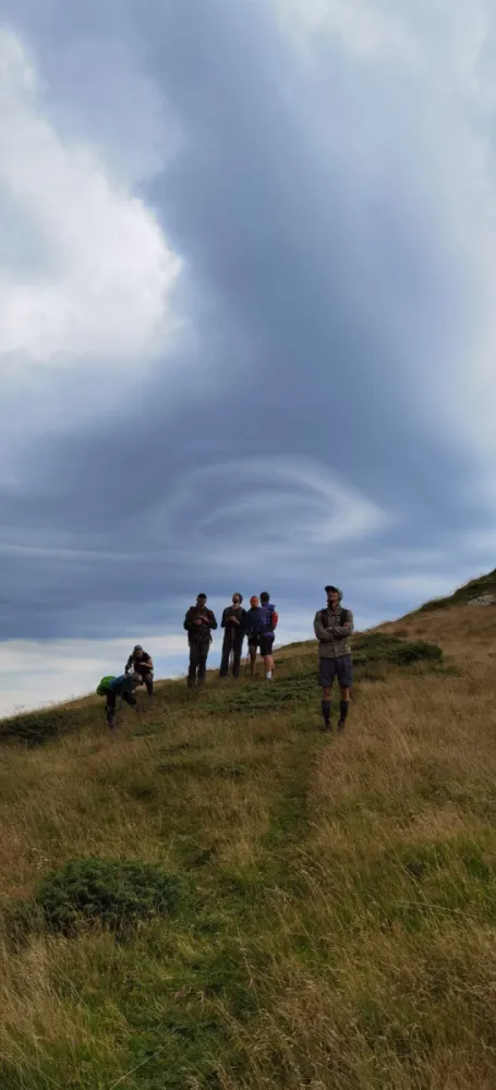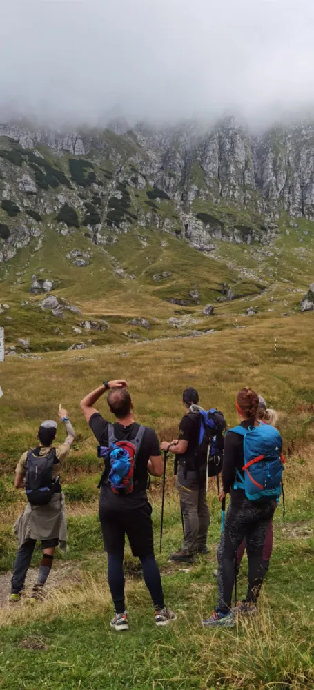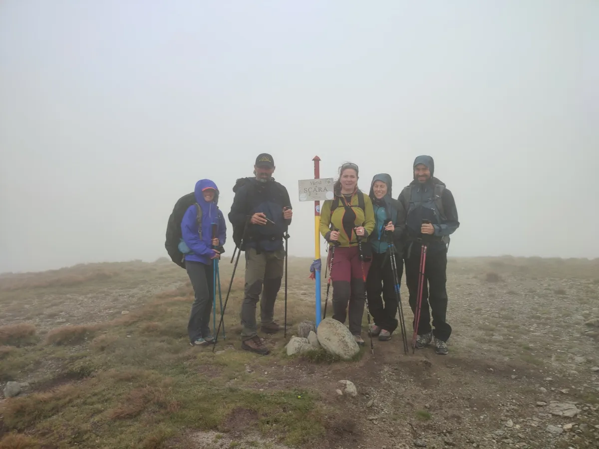 La 8.40 pornim la deal pe traseul stabilit (bandă galbenă BG) spre Padina Crucii, lacul Țigănești și refugiul Țigănești (bagaje mici). Poză de grup la cruce, admirat valea Țigănești și început de ploaie înainte de lac. Giulia și Cosmin nu au echipament de ploaie plus echipament uscat la ei și se vor întoarce de la lac înapoi la cabană. Noi urcăm la refugiu unde stăm la adăpost vreo oră fiind indeciși din cauza vremii dacă vom continua traseul sau nu. Motivul este zona expusă din zona vârfului Scara unde există risc de fulgere. Se liniștește vremea și pornim la deal, cu încurajări de la Geta ”n-am făcut atâta drum să dăm înapoi” :). Așa că pe la Turnurile Țigănești avem peisaj mistic cu ceață, continuăm pe lanțurile ce ne duc sub platoul vârfului Scara și regrupăm puțin după intersecția cu marcajul ce coboară pe valea Ciubotea. Propuneri pentru tura de anul viitor (superbele văi Ciubotea și Gaura). Chiar pe vârful Scara (2422m) ne dă o scurtă răpăială. Facem o scurtă ieșire din traseu la fereastra Țigănești și apoi în Șaua Hornurilor luăm decizia să lungim un pic traseul cu un dus-întors pentru un ceai și o ciorbiță la cabana Omu. Peisaje mistice cu ceață până sus și înapoi până la intrarea în traseul de vară. Schimbăm traseul la sugestia Rebecăi ”să avem panoramă spre partea cealaltă a văii” (drumul de vară în loc de Hornul Mare). Într-adevăr peisaje de vis pe drumul de vară plus ceață foarte faină de la căldarea 2 (de sub Biserică) până la cabană. Seara povești la corturi și cântat/ascultat muzică folk și de munte.