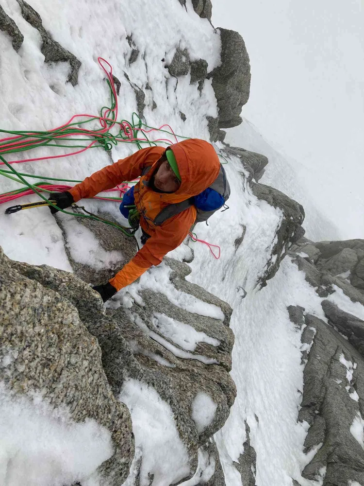 Prima parte a sectiunii de catarare pe gheata(aproximativ 2 lungimi) a fost pe o gheata de calitate extrem de proasta, motiv pentru care s-a decis sa se continue pe portiunile de stanca, pana la creasta, unde a urmat "cursul de inot" prin zapada cu expuneri de 600 de metri stanga-dreapta.