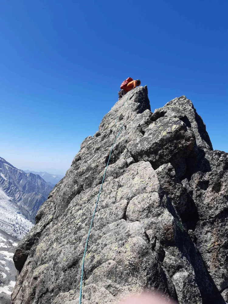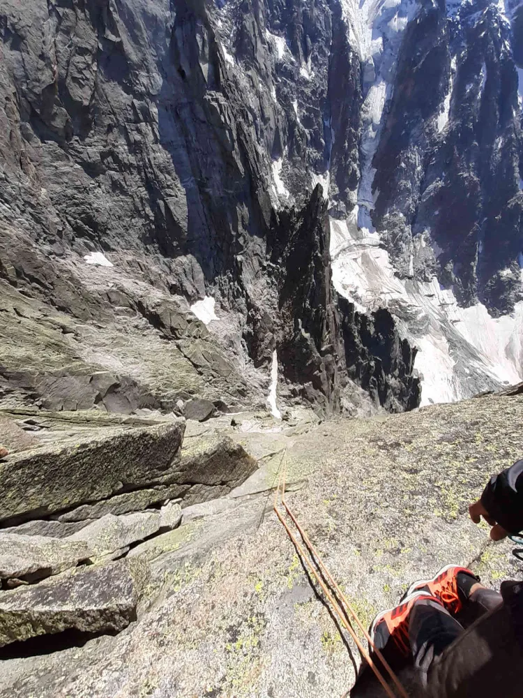Intr-o noua echipa (impreuna cu Alex si Adrian) am urcat din nou pe impunatorul Dent Du Geant. Am avut parte de vreme impecabila, in consecinta si de aglomeratie mai mare. Ca si pe orice ruta celebra o buna parte din timp am petrecut-o trecand corzile altor echipe pe sub noi, peste noi, incercand sa depasim sau sa ne lasam depasiti. Desi are un farmec aparte sa schimbi pareri cu straini in regrupari am simtit ca imi lipseste solitaritatea unui traseu “ca la noi” unde ai prilej sa te regasesti si admiri in liniste muntele.