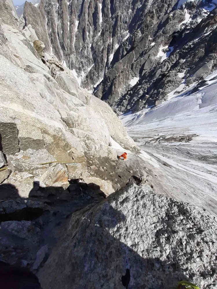 Dupa cateva rapeluri lungi suntem iar pe gingie, ne recuperam echipamentul si pornim inapoi catre Ref. Torino. La refugiu ne bucuram de niste tarte incredibil de bune (recomand cele cu ciocolata) si un espresso autentic. Cu privirea catre Mont Blanc, Mihnea ne arata rute faimoase si pereti a caror nume doar il auzisem dar habar nu aveam da sunt chiar in fata mea.