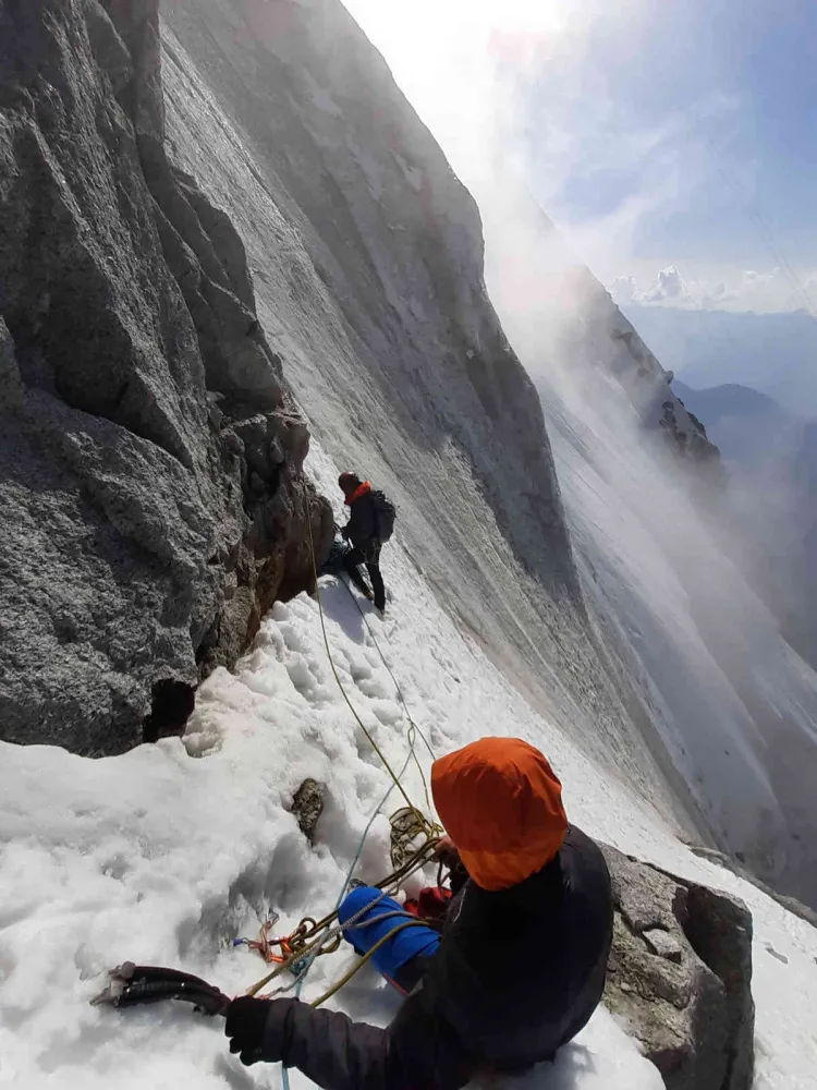 Adi si Alex au ales sa faca Midi-Plan Traverse, un traseu ce continea un approach mediu, cu toate elementele alpine la dispozitie(creste de zapada, fete de zapada, catarare prin hornuri si diedre, rapeluri succesive, scrambling etc.). Fiind vorba de un traseu in linie(pana la Aiguille du Plan(3673m), retragerea a reprezentat drumul pana la summit parcurs in sens invers. Traseul a fost parcurs intr-un timp bun, intorcandu-se totusi pe o zapada de calitate slaba le-a consumat destule resurse la finalul zilei.