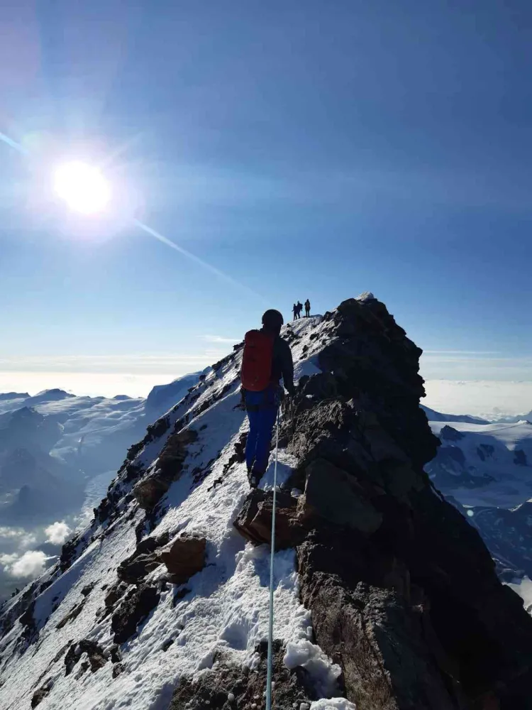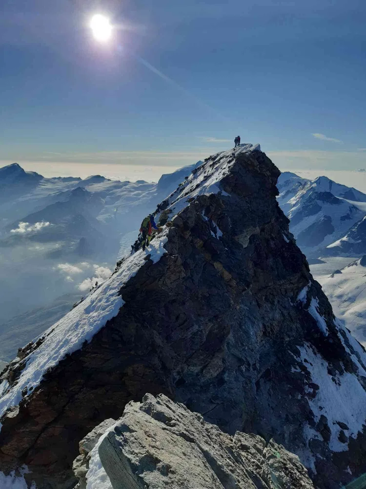 Ne propunem sa fim prima sau a doua echipa ce pleaca dimineata din refugiu. Si chiar reusim. Inaintea noastra iese un ghid cu clientul sau. Insa doar cateva minute in plus si ii pierdem. Avem parte de oarece aventura in gasirea rutei in noapte. Dar principiul este simplu: daca traseul devine dificil si nu sunt corzi fixe, sigur ne-am abatut de la calea corecta. Intre timp suntem ajunsi de o echipa mixta de elvetieni. Vom sta mai departe in spatele lor si cum ei cunosc ruta, totul devine elementar. Din nou ruta este foarte libera. Nu ne intersectam cu nici o alta echipa. Si aerul este cald, chiar foarte cald pentru 4000m altitudine. La rasarit suntem pe Peak Tyndall si deja vedem varful. Urmeaza o sectiune mai dificila, dar echipata complet cu corzi fixe. Urmam sfatul primit seara de la “cabanierul” de la Carrel, evitam scara Jordan si cataram prin stanga ei. Si inca un pas si suntem pe varf. Victorie! Ne-au trebuit mai putin de patru oare pentru a parcurge urcarea de la Carrel pana pe varful italian. Alex insista sa facem traversarea completa a varfului si sa coboram pe creasta Hornli. La inceput reticent, accept. Facem poze cu crucea de pe varf si continuam pana pe Matterhonul elvetian. Suntem agasati de un elicopter ce tot aduce turisti pana deasupra varfului. Peisajul devine complet diferit in partea elvetiana. Daca in Italia ruta era complet uscata si lipsita de zapada, in Elvetia punem coltarii. Alegem sa fim cat mai precauti si coboram intr-o suita de rapeluri. Suntem mult mai lenti decat ghizii cu clientii lor, dar siguranta este mai importanta, iar noi suntem pentru prima data pe aceasta coborare. Asa ca ne ia destul de mult sa descataram intreaga creasta Hornli. Undeva dupa-amiaza revenim la orizontala si sarbatorim cu prajituri si bere rece la cabana Hornli.