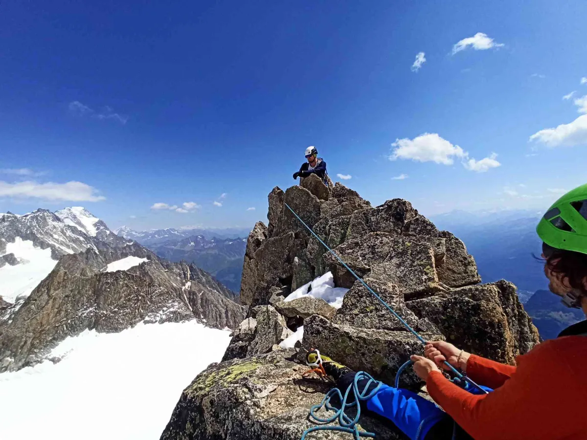 Incepem ziua devreme ca sa prindem prima telecabina din Courmayeur catre Ref. Torino. Dupa ce ne punem coltarii si incepem approachul privesc iar varful si mi se pare imposibil ca intr-o singura zi sa urcam atat de mult, atat de departe. Dar dupa doua ore de mers pe ghetar suntem deja la baza lui si incepem scramblingul pe o zona foarte friabila si plina de grohotis. Dupa inca niste ore bune suntem pe “gingie”, zona de unde incepe adevarata catarare pe “dinte”. Ne ascundem coltarii si pioletii sub o stanca, ne legam in coarda si dupa niste negocieri abile ale lui Mihnea cu restul echipelor, pornim inaintea celor ce asteptau la coada.