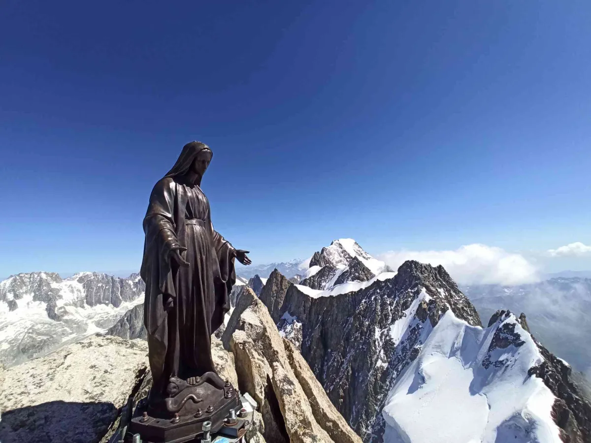Dupa ce urcam cele 5 - 6 lungimi ajungem pe varf unde ne astepta o Madonna de bronz si inca 2 echipe. Ne facem poze, ne felicitam si incepem retragerea.