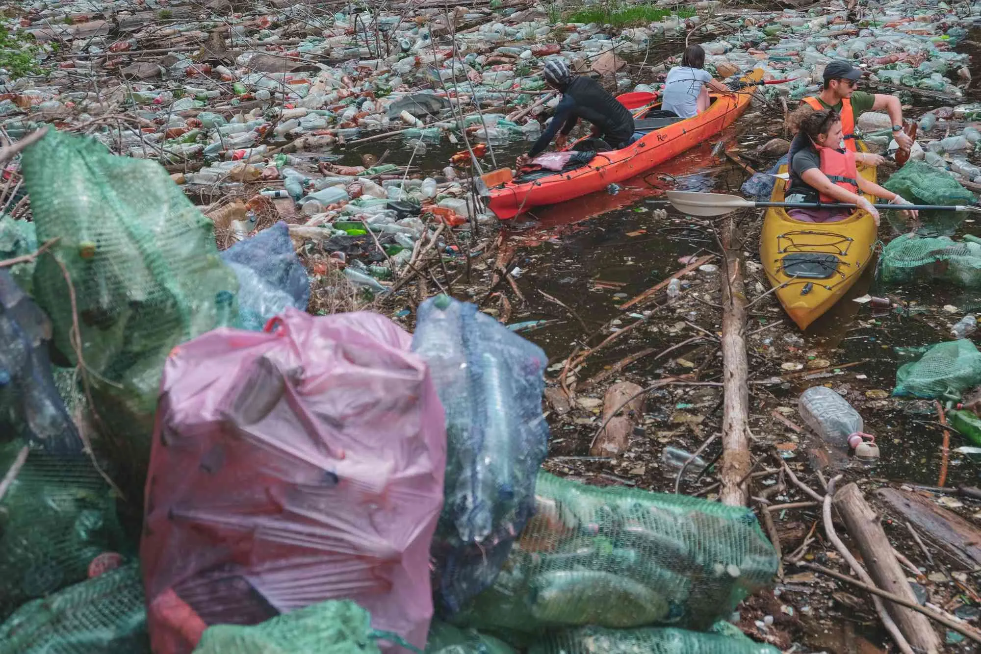Restul echipelor pe apă au intrat frontal în cea mai afectată zonă din această parte a lacului, golful Mestecăniș. Sacii umpluți de voluntari erau adunați de bărcile suport (barca PNA, barca Salvamont și barca Romsilva) iar apoi transferați în punctele de colectare. Pe apă am folosit saci din plasă rezistenți tip raschel care ne permiteau să îi tractăm prin apă cu caiacul iar pe uscat am folosit saci menajeri.
