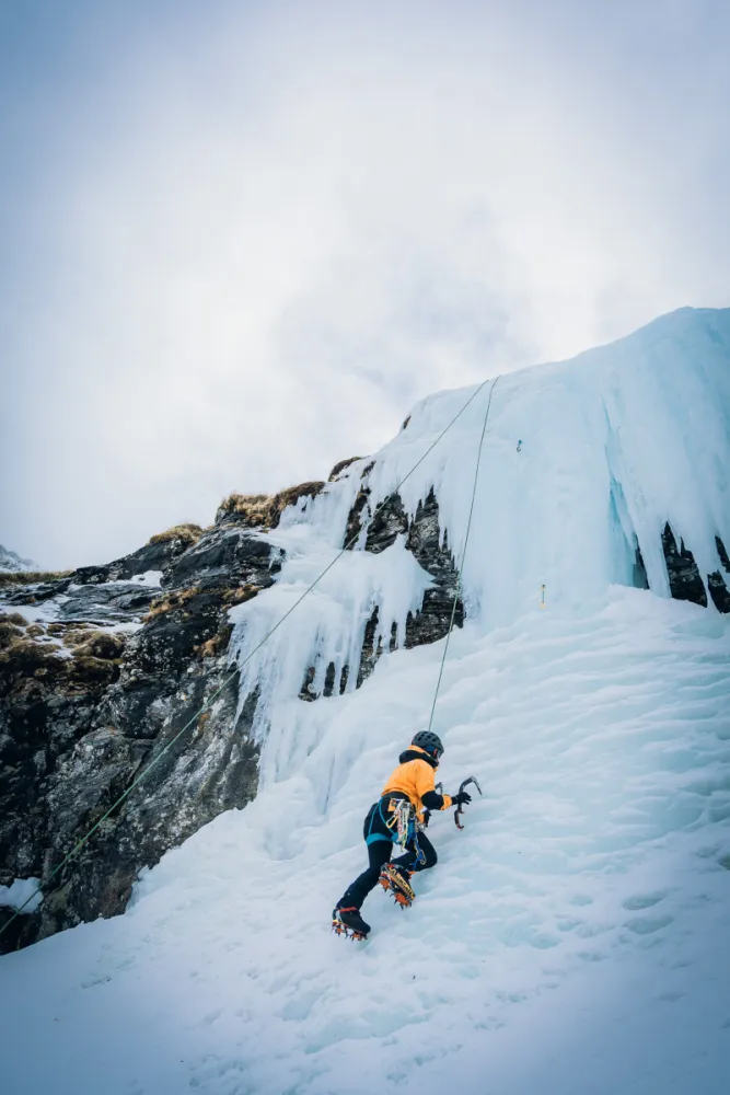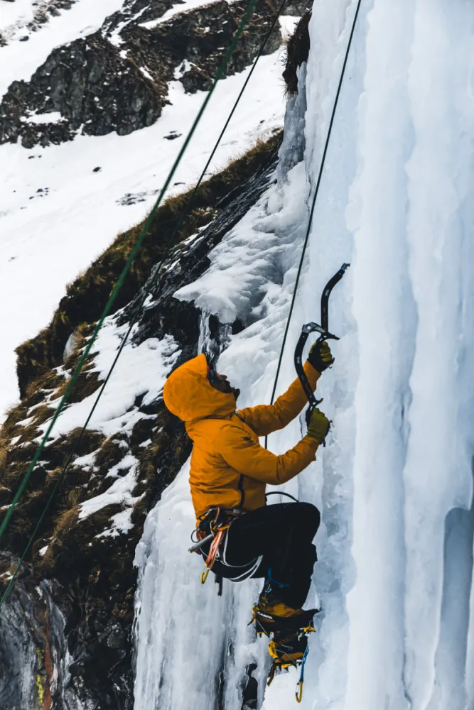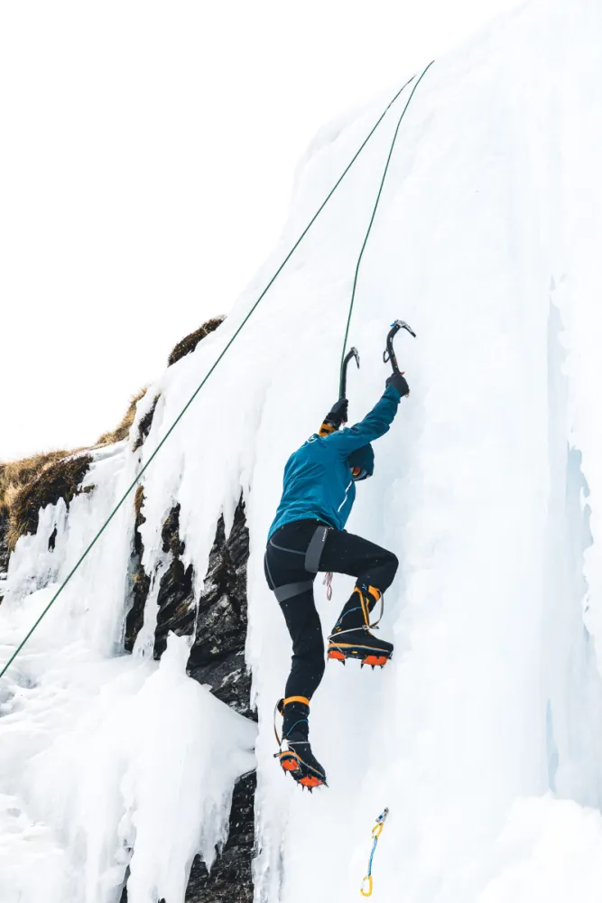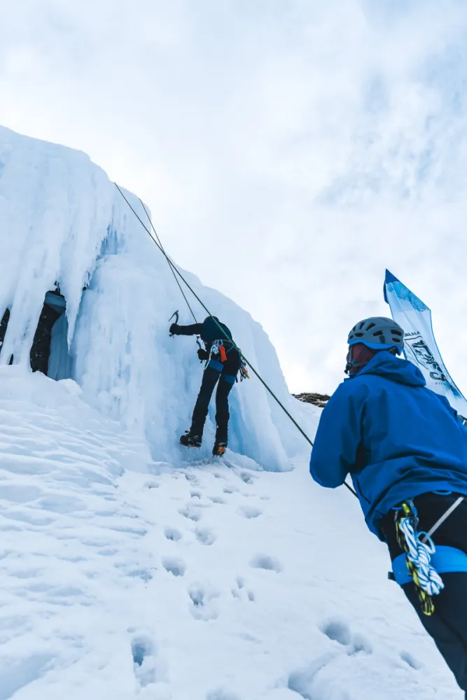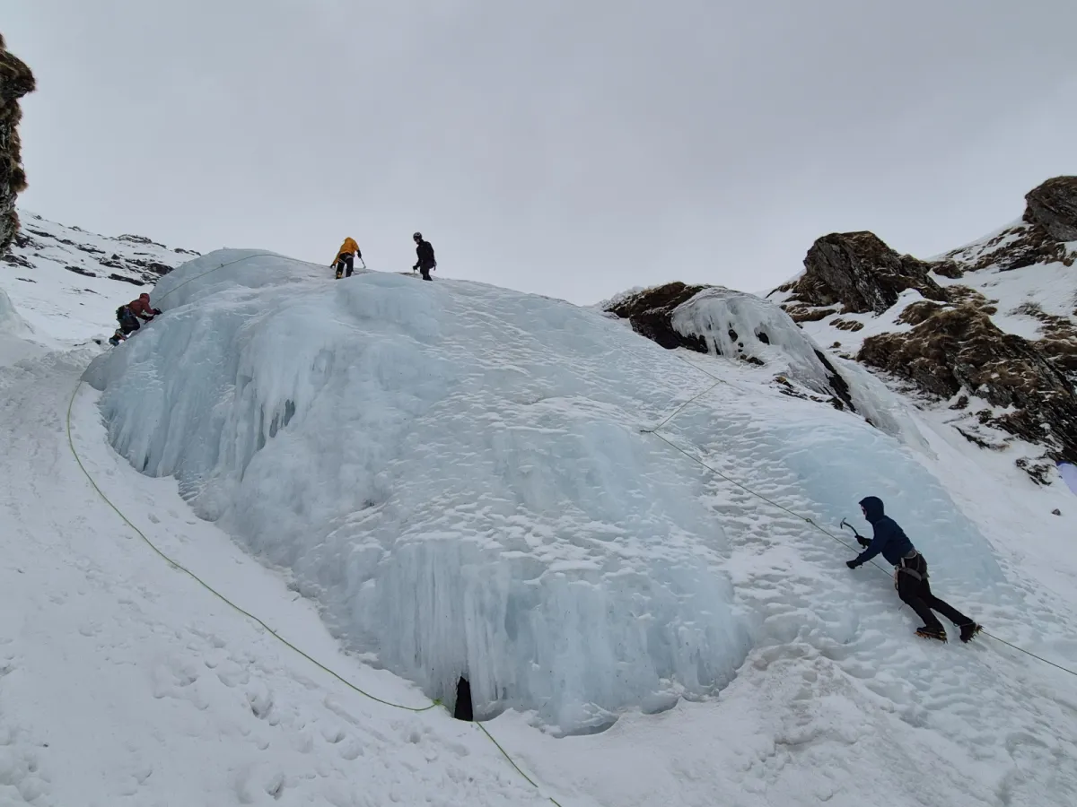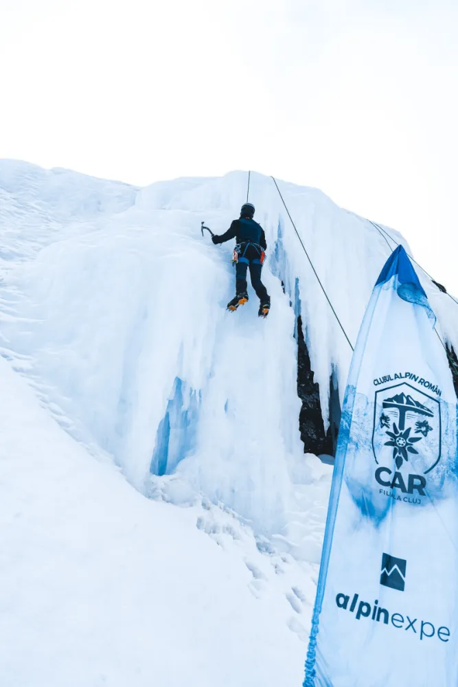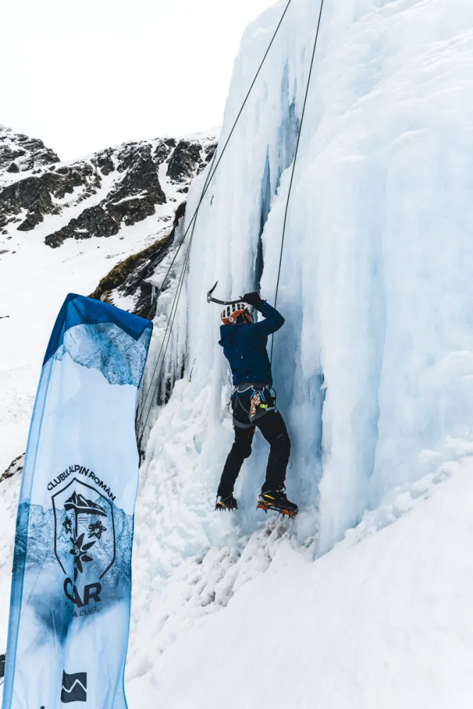 Mihnea ne-a pregătit un exercițiu inedit: a asigurat o coardă în mai multe puncte, de care ne-am legat cu un anou și o carabinieră, într-un fel de „via ferrata pe gheață”. Cu pioleții de tură în mâini, am urcat panta schimbând punctele de asigurare după fiecare șurub. Exercițiul avea un scop clar – să căpătăm încredere în echipament, iar rezultatul a fost pe măsură.