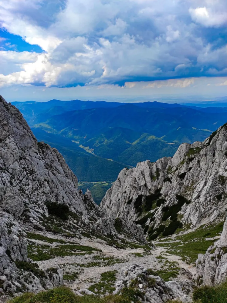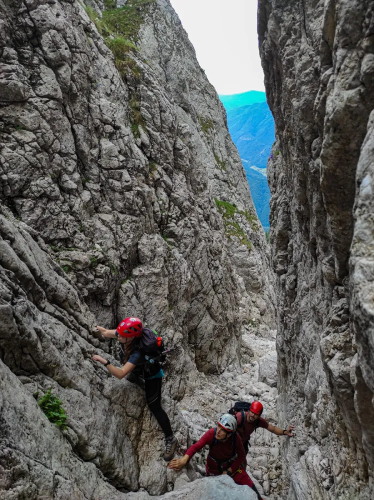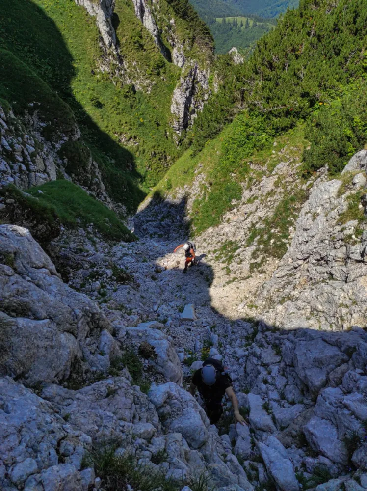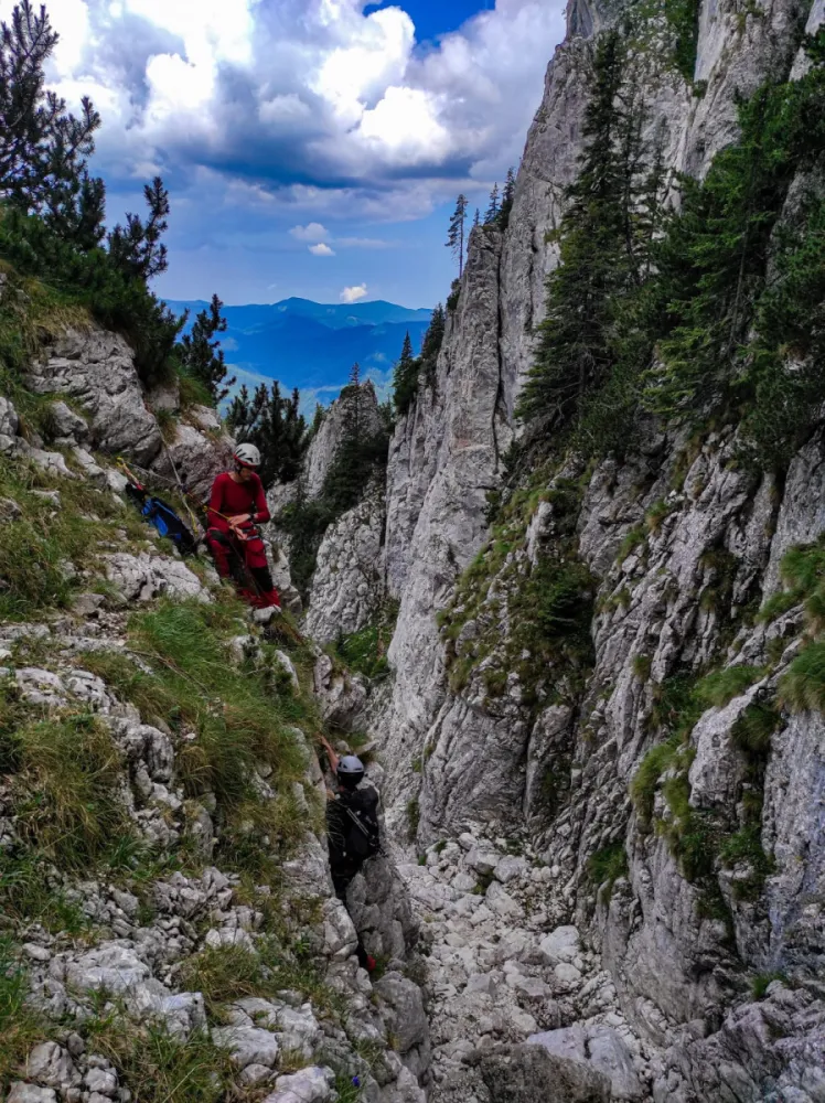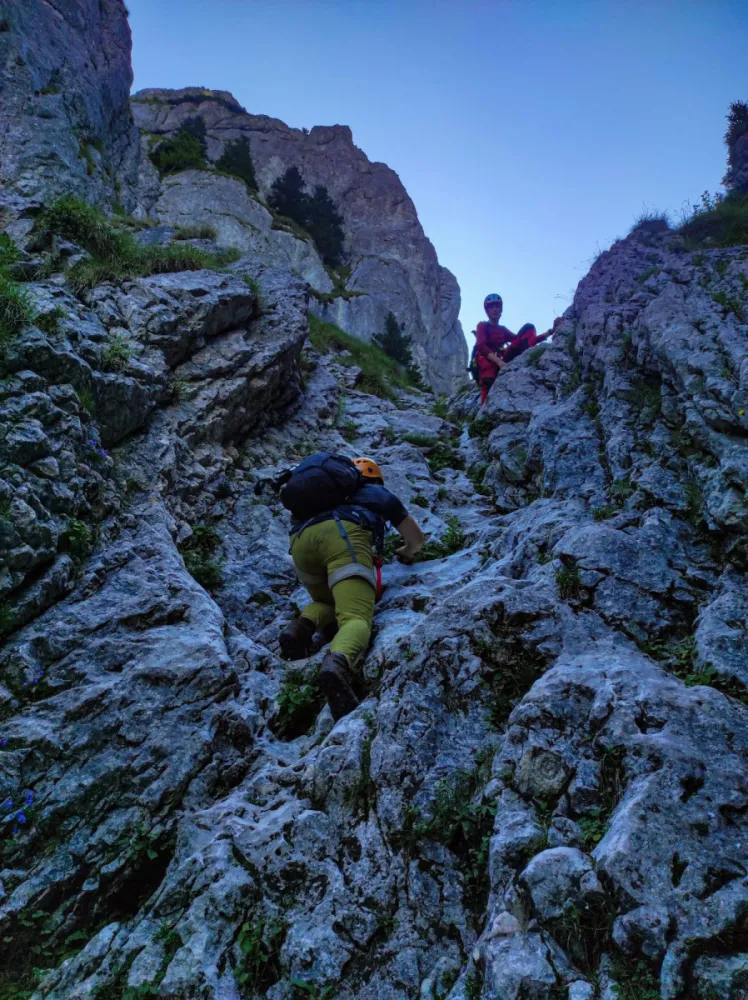 Printre cele mai interesante a fost săritoarea cu lanț(săritoarea mare sau săritoarea cu praștie): un hornuleț vertical, de cel puțin 10-15m înălțime, dotat cu un lanț care să te ajute. Unii au fost mai viteji și au urcat folosind doar lanțul, în timp ce alții au decis să urce asigurați de coardă. Într-un final, le-am trecut cu bine pe toate, sprijiniți de ghizii noștri, Luci și Teo, și am ajuns în creastă, lângă Vf Țimbalul Mare, după o urcare de 6-7 ore. Ne-am luat o binemeritată pauză să luăm prânzul, în timp ce admiram superba priveliște spre Bucegi, Leaota, Postăvaru și localitățile de la baza Craiului.