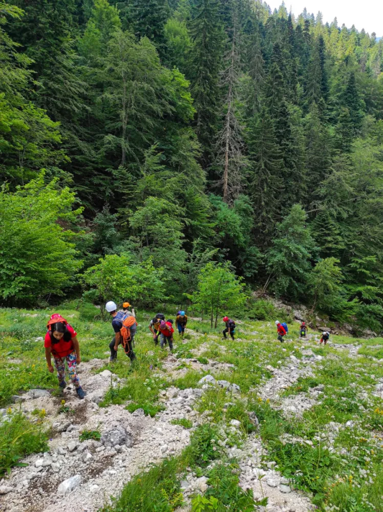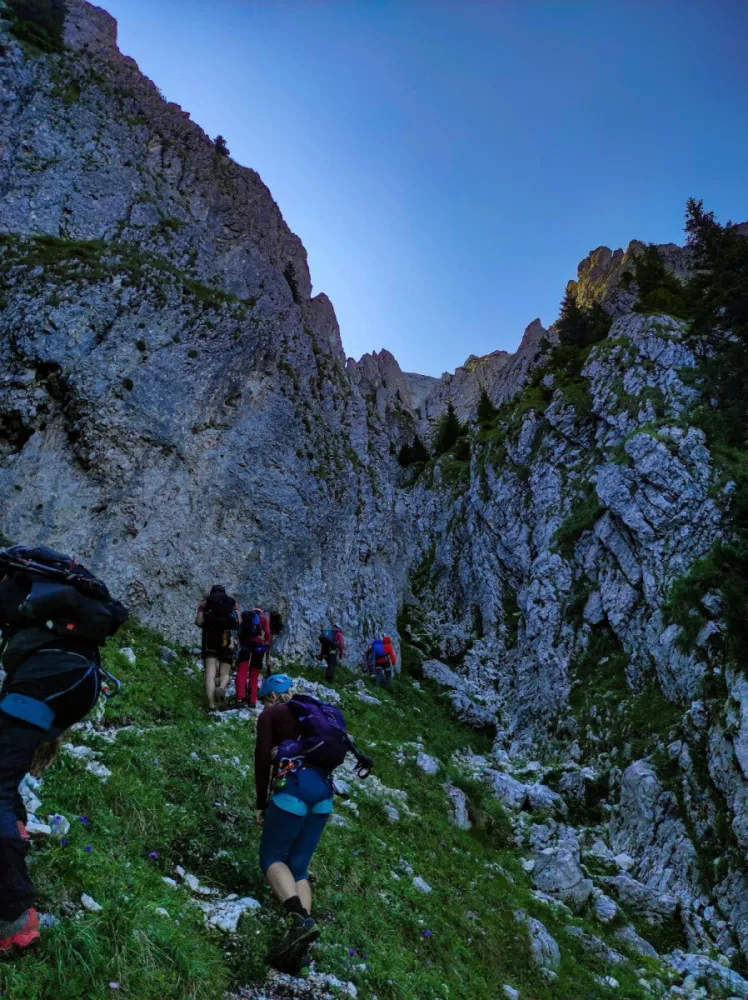 Ziua 1: Sâmbătă la 8 dimineața, după ce am servit micul dejun, cu un cer senin și voie bună, am plecat spre Padina lui Călineț. Urmând traseul marcat TR, am început cu o urcare răcoroasă prin pădure până la Izvorul Căpitanului Orlovski, loc unde ne-am separat de traseul marcat și unde am făcut o scurtă pauză în care ne-am echipat cu hamuri și căști.