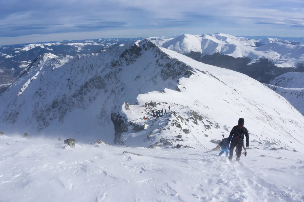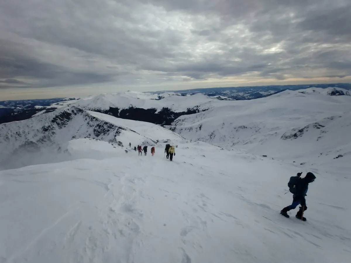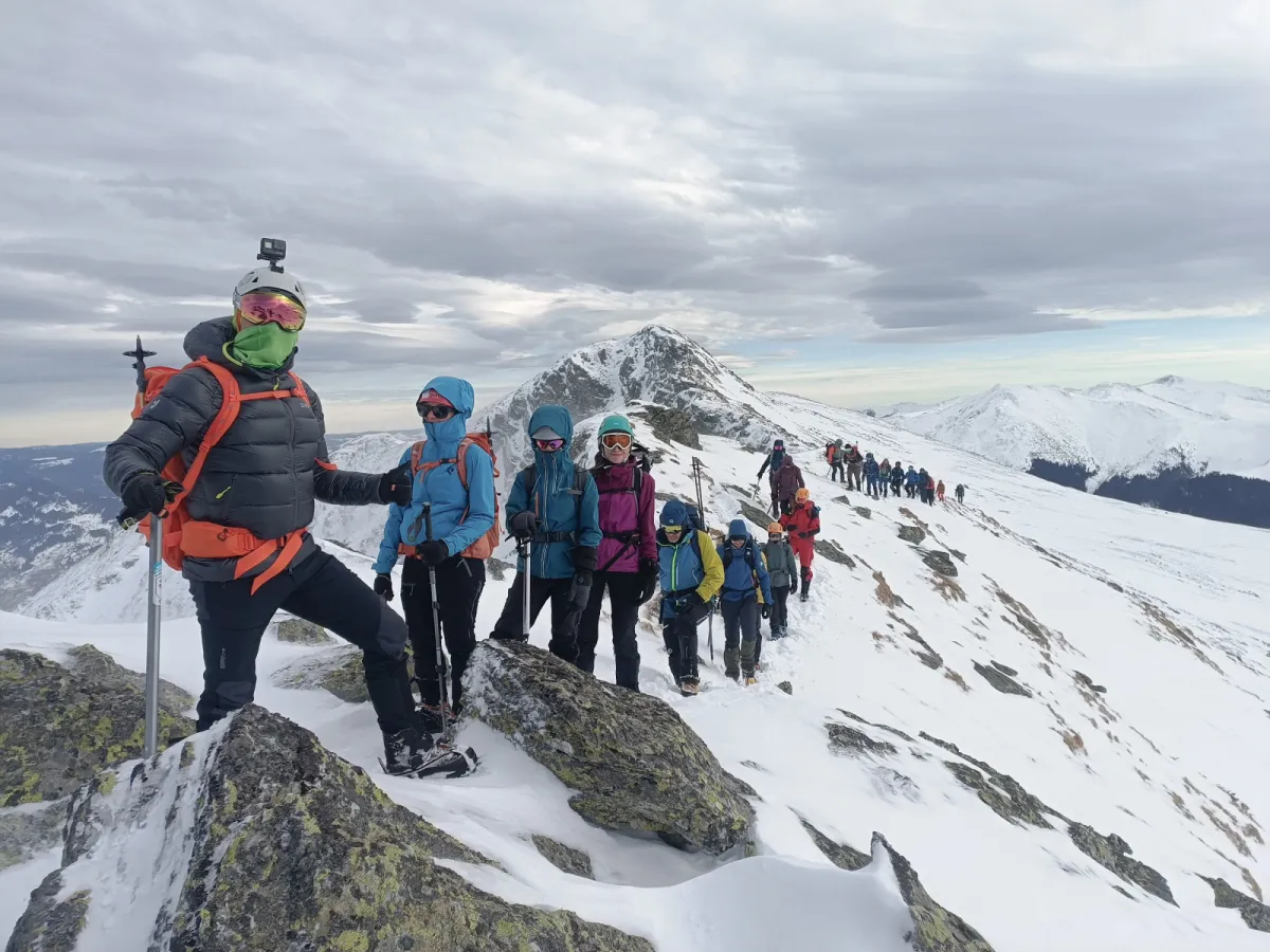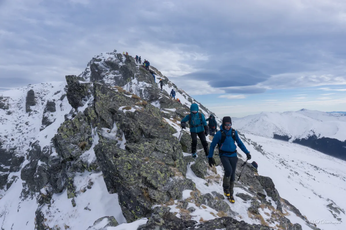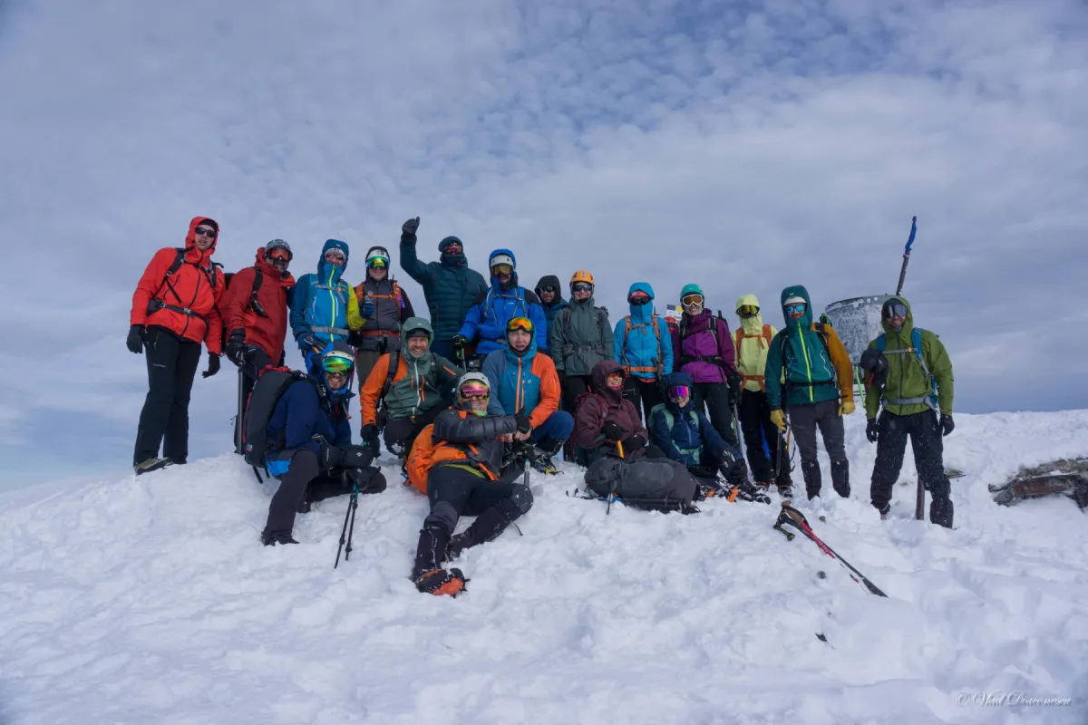 Dimineața, cu echipamentul pus la punct și chef de munte, am pornit la drum. Trupa a fost surprinzător de omogenă, deși eram destul de mulți. Vremea nu ne-a iertat – în creastă vântul sufla cu 40-50 km/h, testându-ne rezistența și hotărârea. Cu toate astea, am ținut ritmul și ne-am bucurat de fiecare pas făcut spre vârf.