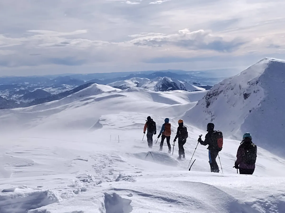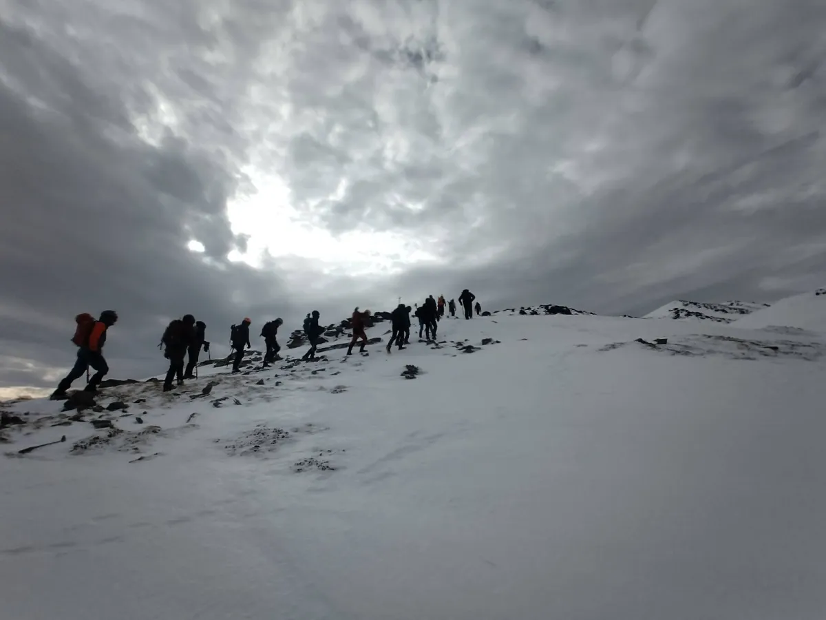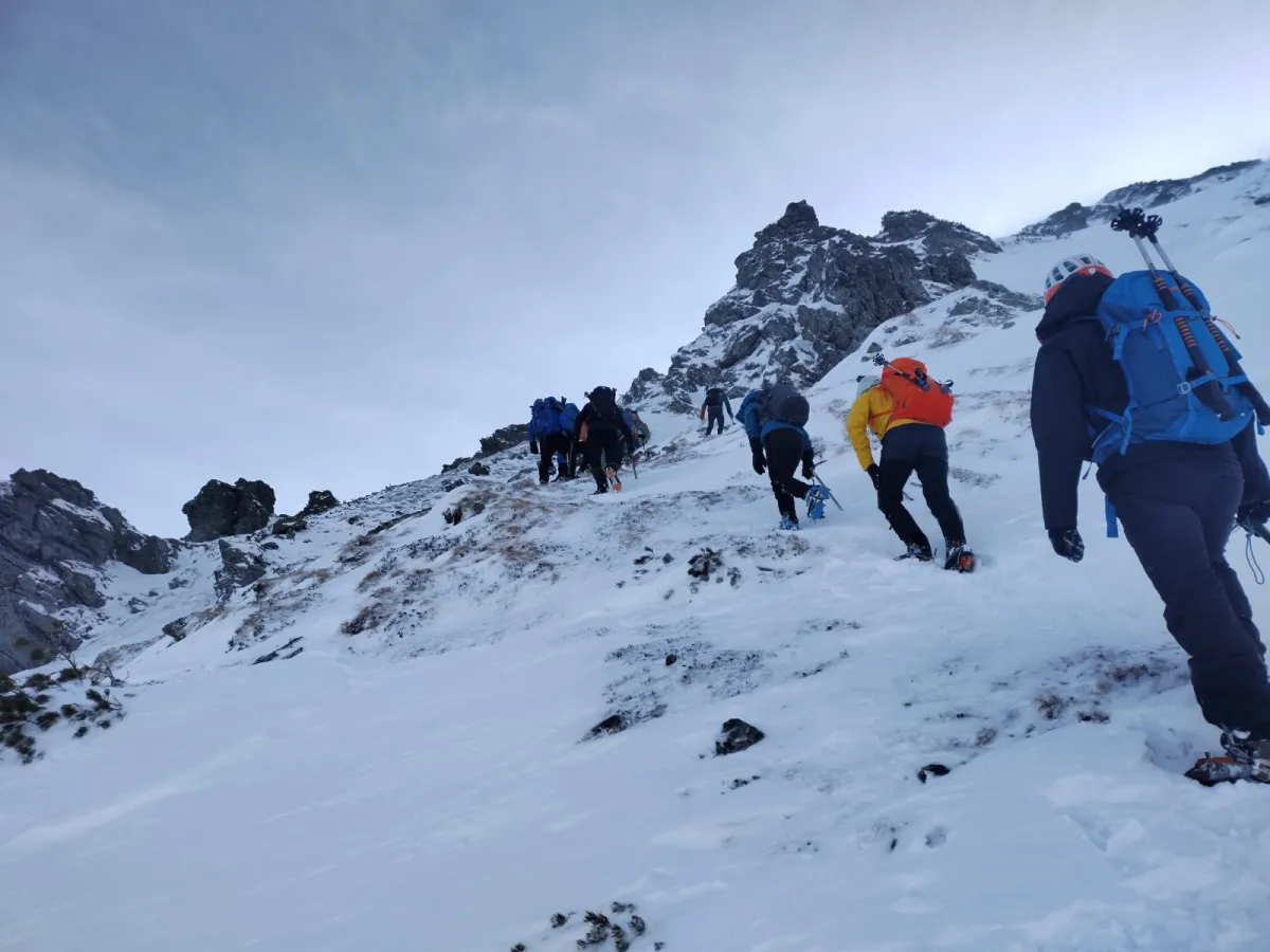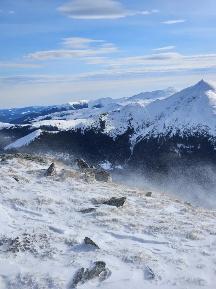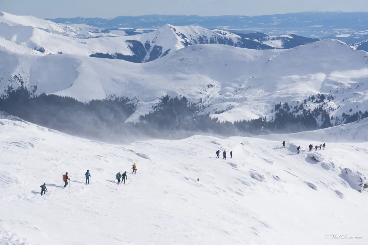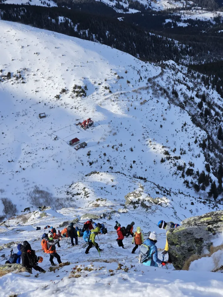 Dimineața, cu echipamentul pus la punct și chef de munte, am pornit la drum. Trupa a fost surprinzător de omogenă, deși eram destul de mulți. Vremea nu ne-a iertat – în creastă vântul sufla cu 40-50 km/h, testându-ne rezistența și hotărârea. Cu toate astea, am ținut ritmul și ne-am bucurat de fiecare pas făcut spre vârf.