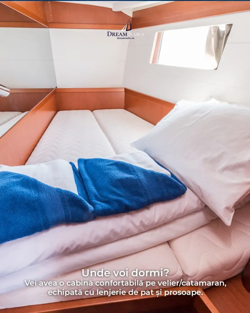 - Vom dormi pe bărci cu vele în cabine cu 2 locuri, 2-3 băi cu dușuri, bucătărie + living room (salon). În unele nopți vom acosta în porturi, iar în altele vom ancora în golfuri în apropierea plajelor.