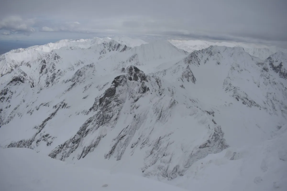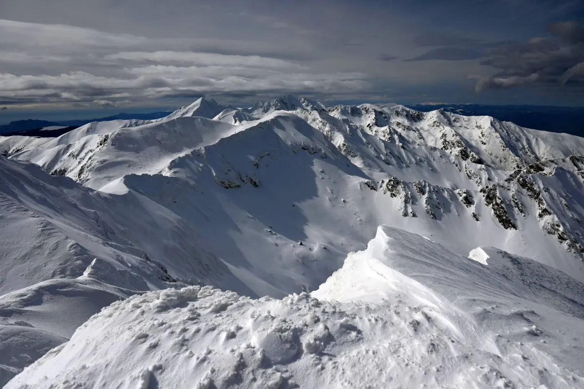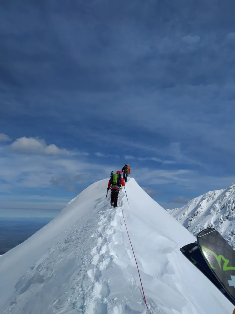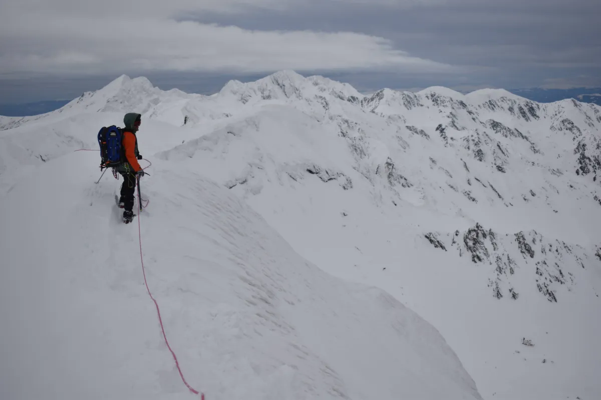 Ajunși în șaua Capra facem un scurt popas pentru a ne bucura de panoramele superbe care începeau să se deschidă, după care ne continuăm urcarea spre vârful Văiuga. Avem parte de zăpadă afânată, dar și de zone cu gheață și stâncă, așa că aplicăm practic toate tehnicile învățate de folosire a pioletului. După vârful Văiuga terenul devenind expus, trecem la legarea în coardă.