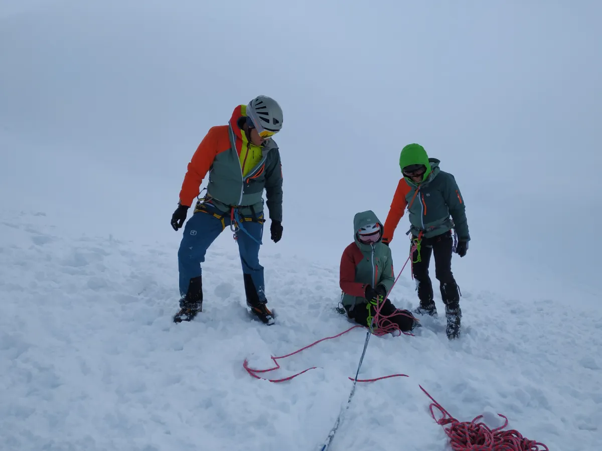 Sâmbătă avem parte de vreo 15 cm de zăpadă proaspătă, viscol și ceață aproape de whiteout, așa că ziua este dedicată în întregime exercițiilor practice. Marius alege un teren care să îmbine siguranță cu condițiile necesare și, pentru că repetiția este mama învățării, timp de câteva ore exersăm cu toții de mai multe ori mersul cu colțari și folosirea pioletului. Cu tactică și cu răbdare Marius și Mircea ne urmăresc și ne corectează pe fiecare în parte, astfel încât cu toții rămânem cu siguranța însușirii corecte a informației. În continuare învățăm să facem amaraje în zăpadă și cum asigurăm partenerul folosind aceste amaraje, ne grupăm în echipe de câte doi și exersăm. Când vântul se întețește și ceața nu ne mai permite să vedem prea mult, ne retragem la refugiu.