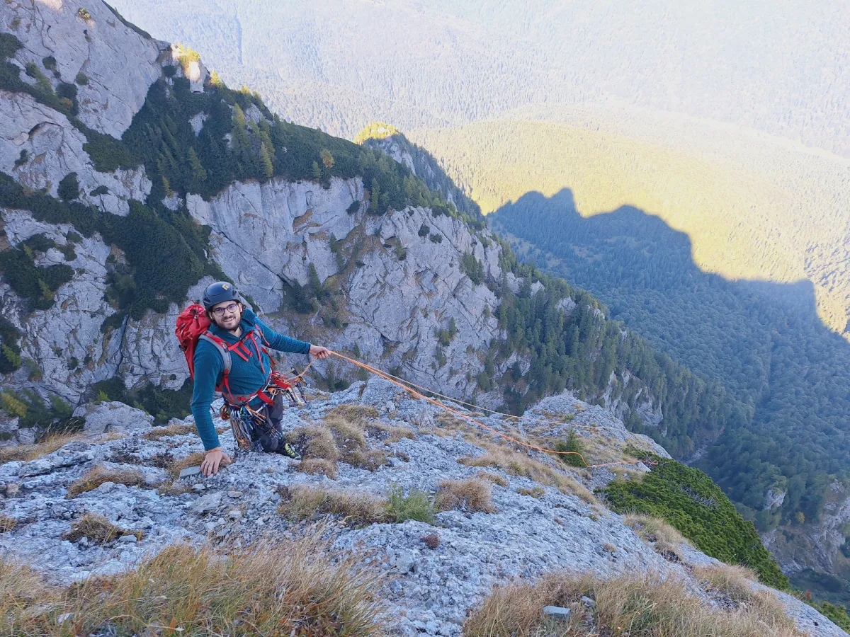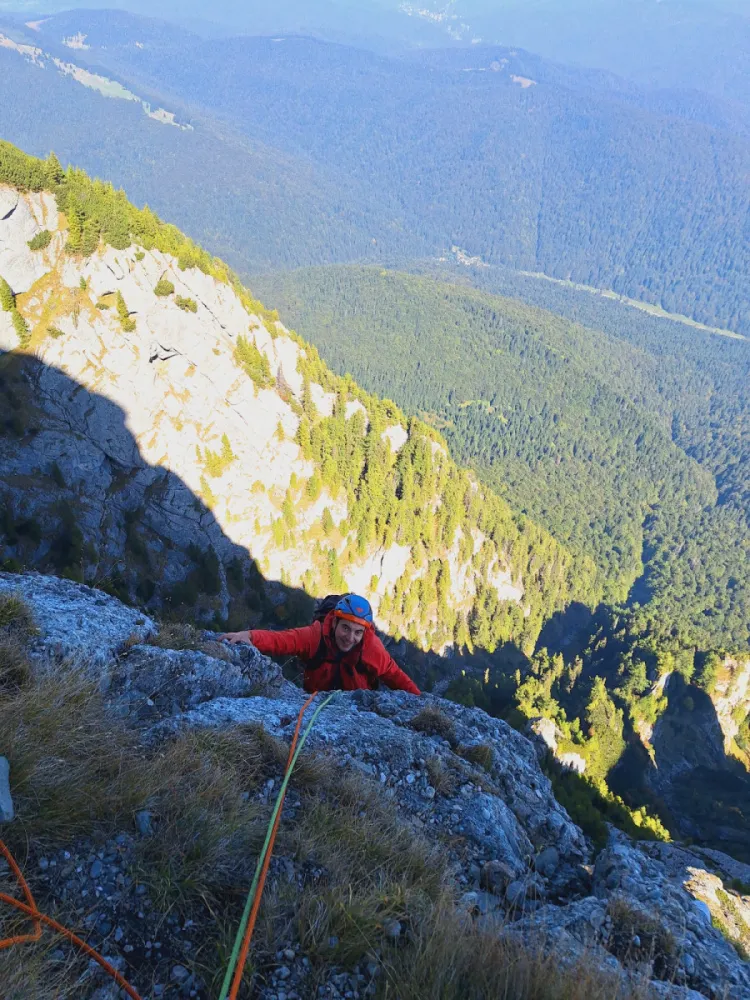 Următoarea zi ne-am trezit de dimineață și am coborât la Căminul Alpin, de unde am plecat spre Cheile Râșnoavei, în echipă restrânsă: eu, Radu și Adrian. Acolo am făcut primele două lungimi de coardă (~55m) ale Crestei Generalului. Radu a urcat cap, iar eu și Adrian manșă.
