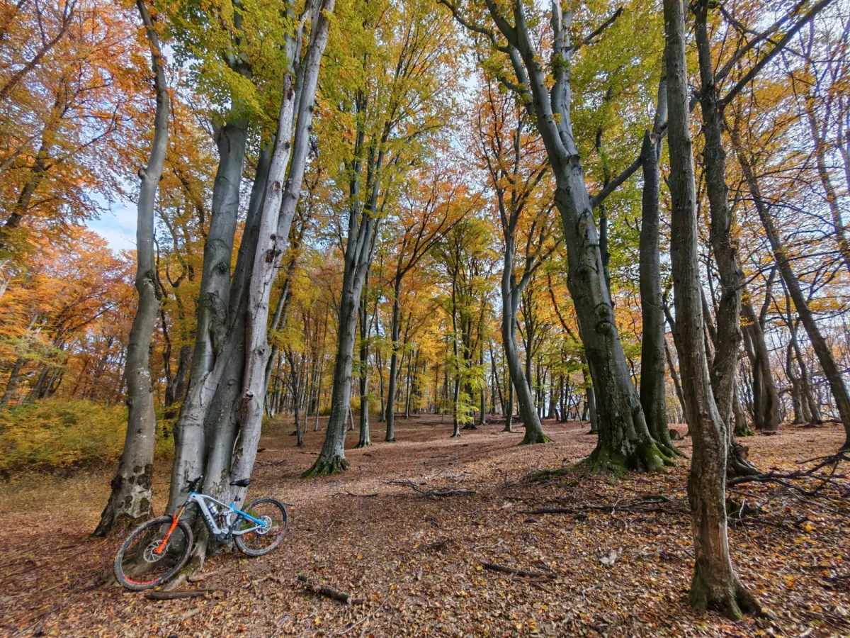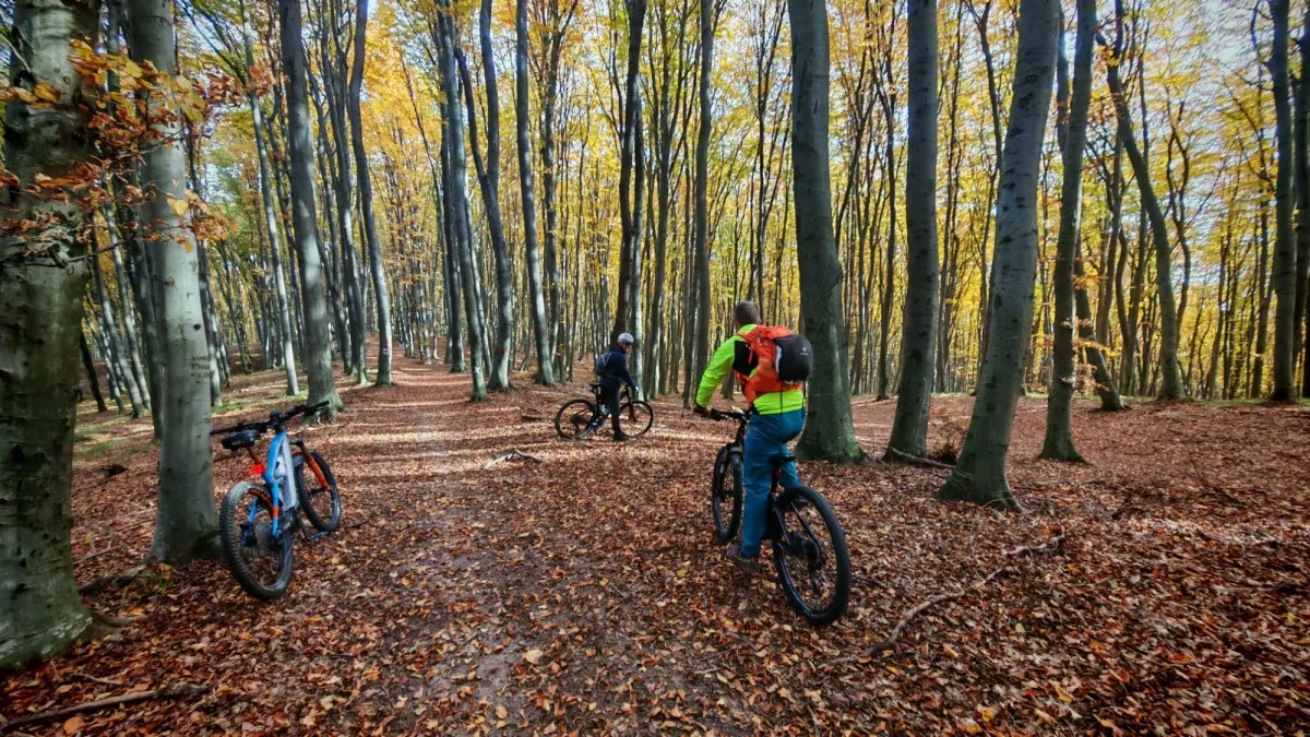 Teoretic, trebuia să pornim în tură la ora 9 dimineața, dar micile întârzieri din trafic au făcut ca abia pe la 10 să începem să pedalăm. Pădurea ne-a întâmpinat cu crengile larg deschise, cu o paletă de culori calde și poteci bătătorite. Drumul ni se deschidea în față, cu umbre jucăușe peste covorul de frunze galbene, proaspăt așternute.