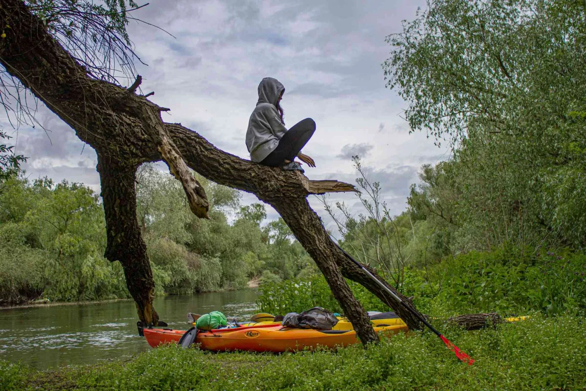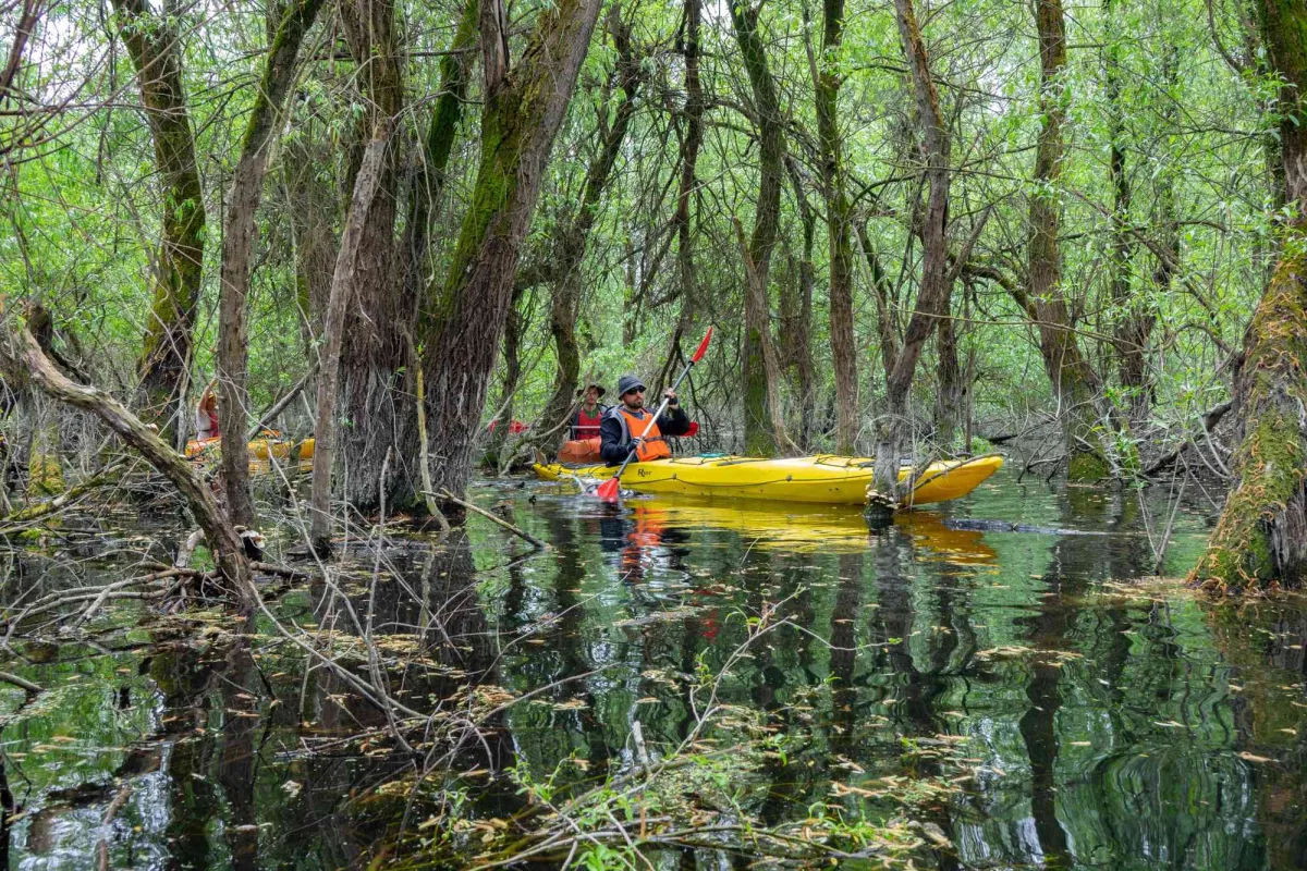 Poate vă vor îndemna și ele spre acolo ! Unde veți face o altfel de drumeție: nu veți da din picioare, ci din brațe ! Am avut norocul ca în recenta tură prin mirifica Deltă, să nu padelăm doar pe canale și lacuri, ci și prin pădurea inundată ! Deși ca ”șofer de caiac” eram începător, am învățat rapid să mă descurc, chiar dacă la unele ”curbe” strânse, trebuia să dau și cu spatele, cum văzusem că făceau autobuzele pe șosele ”transfăgărășene” din Alpi, cărora li se dădea prioritate.