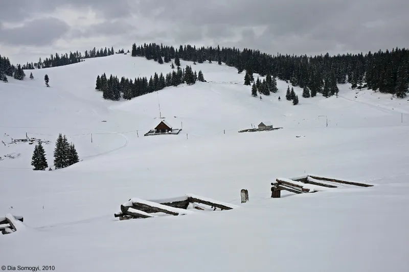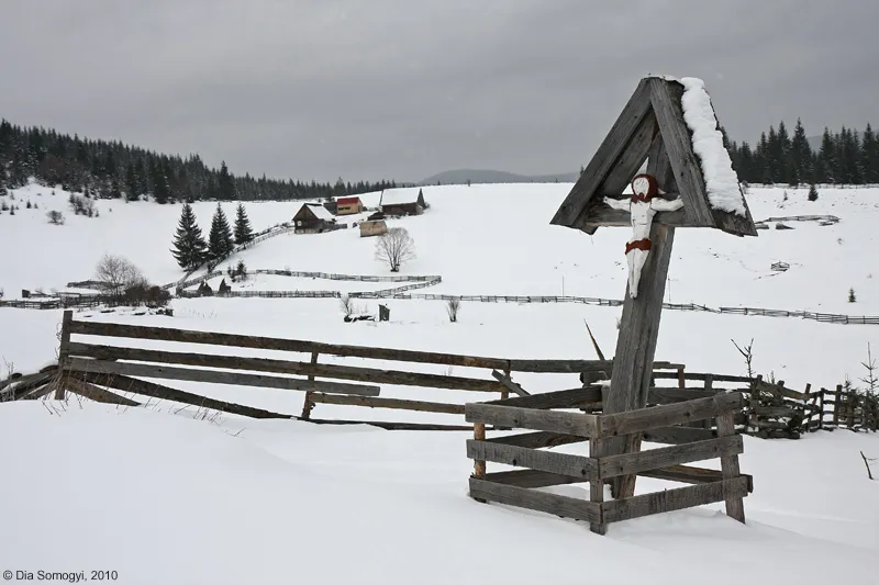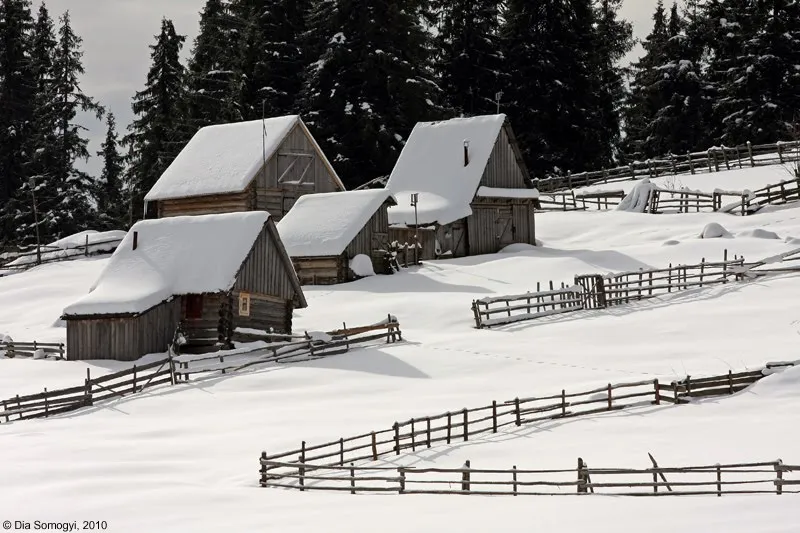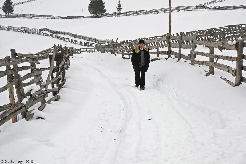 Doi ochi albastrii sub o cusma mi-au atras atentia si alungat dupa doar cateva sute de metrii oboseala complet: „ Incotro dom’soara? Da va da frigu aiesta afara din casa?!? (...) S’apoi nu-i greu la deal cu-asa bagaj mare?”. I-am raspuns involuntar „Linistit sa stati, greul asta il prefer oricand, s-apoi eu nu stiu sa-mi fie mai greu decat cand tre’ sa shed in fund la birou”. Ne-am zambit si urat reciproc sa mergem cu Dumnezeu mai departe. Dupa cateva minute, aceeasi ochi patrunzatori ne-au depasit calare, pe un armasar negru si foarte sprinten. Am regretat ca n-am aparatul in gat, ci in rucsac, dar nah, fapta consumata! In culme o femeie, de la care am aflat ca unde vrem noi s-ajungem e „haaa...tumna tumna departe, incolo, peste dealurile alea impadurite”. Mai incolo...garduri!!! Garduri peste tot, geometrii frumoase, brazdand cu cenusiul lor albul zapezii.