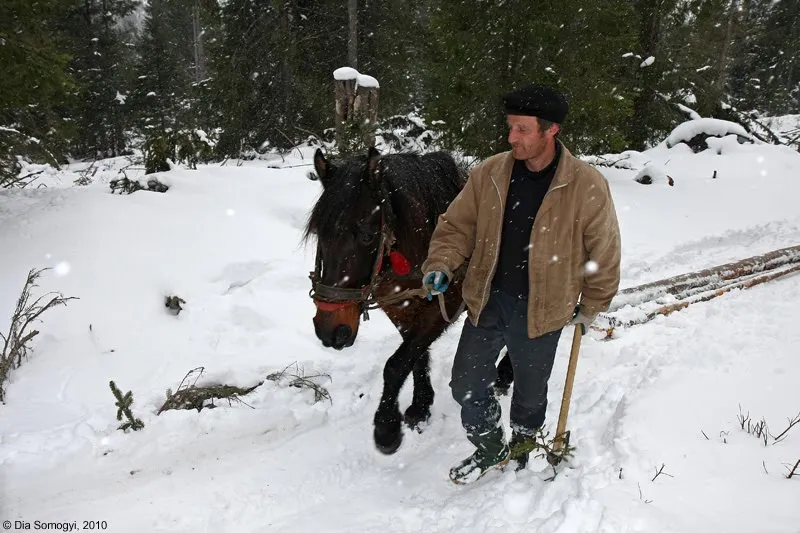 Povestesc cu localnicul, il intreb cum e viata lui, el ar face schimb cu a mea...eu tanjesc dupa a lui uneori. Imi vine sa-i mangai calul, dar imi opresc impulsul, caci e incarcat si nu suntem inca prieteni. Imi e mila si drag de genul asta de oameni, care merg dupa cate un lemn doua, cat sa incalzeasca bine camera pruncilor si-a sotiei. Stiu ca daca l-as descoase as afla multe, dar nu-i timp de pierdut din ambele parti, caci seara se lasa repede in Faurar, si mai avem un codru de paine pana in poiana mult visata. Si ninge! Doaaamne, cum ninge! Mai incolo ne scufundam, vrem sa mergem pe curba de nivel conform GPS-ului, dar ezitam putin, si fix atunci un alt motz calare apare si ne intoarce din drum, spunandu-ne ca drumul spre Marsoaia e mai lesne pe cel pe care merge el. Schimbam vorbe, ne dam cu parerea despre vreme, el merge „pan’ mai mintenash” unde il asteapta un fecior, sa taie un brad. Inghit in sec, am alergie la brazi taiati, dar apoi ma gandesc ca oamenii de pe-aici din asta traiesc, si cata vreme nu fac din asta o afacere ci isi duc existenta e oarecum firesc sa fie asa. Clocotesc totusi de nervi cand vad ca taie cel mai inalt brad. De ce nene!?! De ce...? Imi propun sa observ daca si feciorul ce-l asteapta e tot din breasla albastrilor, ma apropiu si-l salut scrutandu-l cu privirea si ma rusinez de intimidarea lui. Las, macar ii sedea bine asa cu bujori proaspeti, prea era palid. Iar ochii, ochii ii erau caprii si mari.