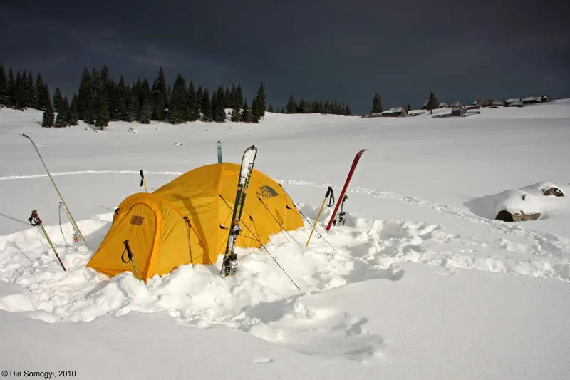 Mai e putin, sap...sap...sap, si-n fata ochilor imi ies niste casute asa dragute in fata! Cad pe ganduri, le-ntreb ‚da voi de unde-ati aparut?’ . Cred ca-n gand mi-au raspuns si ele ‚poate Tu de unde-ai aparut, ca noi suntem aici de-o viata, musafirule!’. Imi place aici, imi vine sa tip de bucurie...sa ma descarc de toata tensiunea acumulata. Trag un chiot, si-mi dau seama ca toata tensiunea am presarat-o pe drum, batand urme, sunt purificata de energie negativa! Ii propun lui Dan sa punem casuta aici, stiu ca suntem la o aruncatura de bat de Poiana Marsoaia, e chiar dincolo de micul damb, dar aici...in fund de oala, cu case de-o parte si alta, ma simt atat de altfel...si protejata. Suntem in Poiana Dupa Case, si-mi place teribil. Pofta de Nou invinge inertia amintirii, el cedeaza cand ma vede hotarata si-n scurt timp batem urme. Pfuuuaai, e crunt! Talpile ma ard si ustura, zapada nu se aseaza, vantul bate, binenteles ca ninge...si-mi urla gatul dupa o scalda de ceai cald. Despachetam, aranjam, pregatim. Cortul se umple cu sacii, si pufnesc in ras: albastrii! Le stiam culoarea, dar azi, cand tot albastru am gasit la tot pasul, asta e parca cireasa de pe tort.