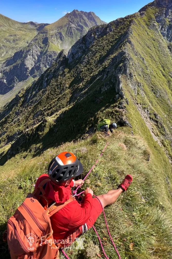 Sâmbătă iarăși vreme bună și una dintre cele mai faine culmi din Carpați! Se deschid vederi unice asupra Făgărașilor pe care nu le-ai bănui, chiar din mijlocul acestora, mai ales de pe Vf. Mușeteica. Calci pe o culme pe care îți dorești să nu se mai termine. Nici prea ascuțită, nici prea lată, nu-i periculoasă, nu are diferențe mari de nivel între vârfuri. Strângem corturile, la 8:00 urcăm cu bagajul mare pe piciorul estic care ne conduce direct pe Vf. Buda. De acolo continuăm înșiruirea de vârfuri Râiosu, Mușeteica, Mesteacănul, Piscu Negru.