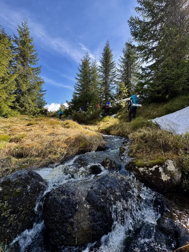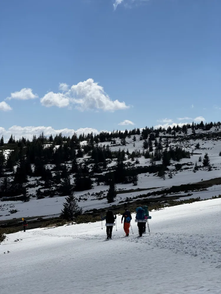 Ajunși la locul de întâlnire ne-am mai organizat rucsacii pentru o ultima data înainte de a porni, astfel încât sa adaugam tot echipamentul și sa “be bold, start cold” ca sa ne încălzim pe parcurs. Tura începe ușor cu o urcare către vârful Muntelui Mare cu rucsacii, și ei mari, în spate. Ca de obicei personal eu mor în primele 15 minute din oricare tura ca sa renasc ulterior ce îmi asez rucsacul cât mai confortabil. Ușor-ușor isi face apariția și zăpadă lucru care ne bucura pentru ca zăpadă este în aceasta tura în centrul atenției - urmează sa dormim in ea. Pe drumul pietruit ajungem în vârful muntelui Mare și ne orientam după “ Mausoleul din Halicarnas” - ceva obiectiv militar de unde începe sa o luam prin pășune și suntem întâmpinați de doi căței de dimensiuni insignifiante din depărtare care pe măsură ce se apropie cresc treptat în dimensiuni semnificative. Dar nu este nici o îngrijorare întrucât maoritatea participanților au fost atenți la cursul introductiv de miercuri și au la ei un obiect important supravieturii pe munte - fluierul. Sufland de mai multe ori în fluier cățeii abandonează interesul pentru noii călători și ne continuam voioși drumul către Refugiul CAR. Terenul este pe alocuri mlastinos de la zăpada topita pe portiunile unde soarele a insistat dar majoritatea portiunilor sunt acoperite de zăpadă înșelătoare în care Riști sa te scufunzi. Pasind atent reușim sa evitam zonele de risc și sa amânăm semnificativ timp parazăpezile. Nu după mult țimp ajungem la un peisaj feeric în timp ce coboram către Refugiul CAR. Un mic rau apare de sub zapada topita si șerpuiește ademenitor la vale. Traseul pe care alegem sa îl facem este chiar deasupra râului așa ca îl sărim de mai multe ori spre deliciul nostru. După aceste traversări ne întoarcem pe traseu de coroborare și zăpada deja creste fortandu-ne pe majoritatea sa adăugăm și parazăpezile.
