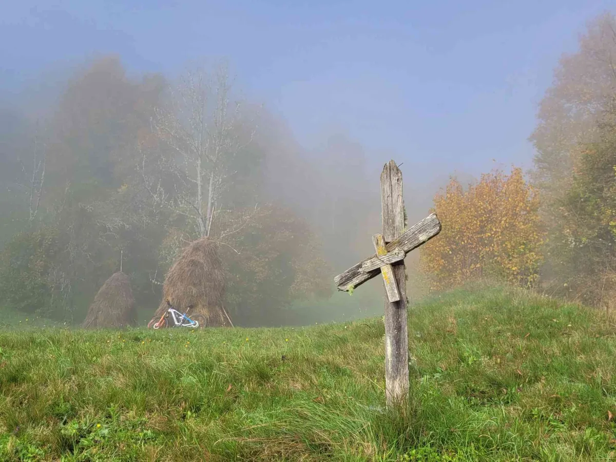 Călăuziți de marcajul banda roşie, după doar vreo 2-3 km, în zona cătunului Joldisesti, ne oprim din nou la o pauză de mâncat mere de dimensiuni considerabile. Continuăm tot pe culme și trecem pe lângă câteva superbe troiţe din piatră, iar după Medresti ne angajăm în ocolire pe curbă de nivel a Vârfului Chiuzu (1023) unde ne mutăm pe piciorul care ne va conduce înapoi în Gura Sohodol. Facem o ultimă oprire pe drumul înierbat admirând priveliştea care cuprinde Vârfurile Negrileasa Mogoșului, Detunata Goală, Geamănă, Corabia şi Dâmbău. În scurt timp părăsim piciorul principal şi urmăm iniţial curba de nivel, apoi intrăm în coborâre susţinută și pe alocuri tehnică, pe sub cătunele Bazesti şi Nicoreşti, spre valea Sohodolului. Ajungem la Gură Sohodol încă pe soare încheind o frumoasă tură într-o zi foarte caldă de octombrie. Ca de obicei, calde mulţumiri Alinei şi lui Marius, pentru ghidare şi compania foarte plăcută!