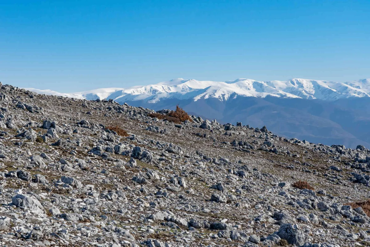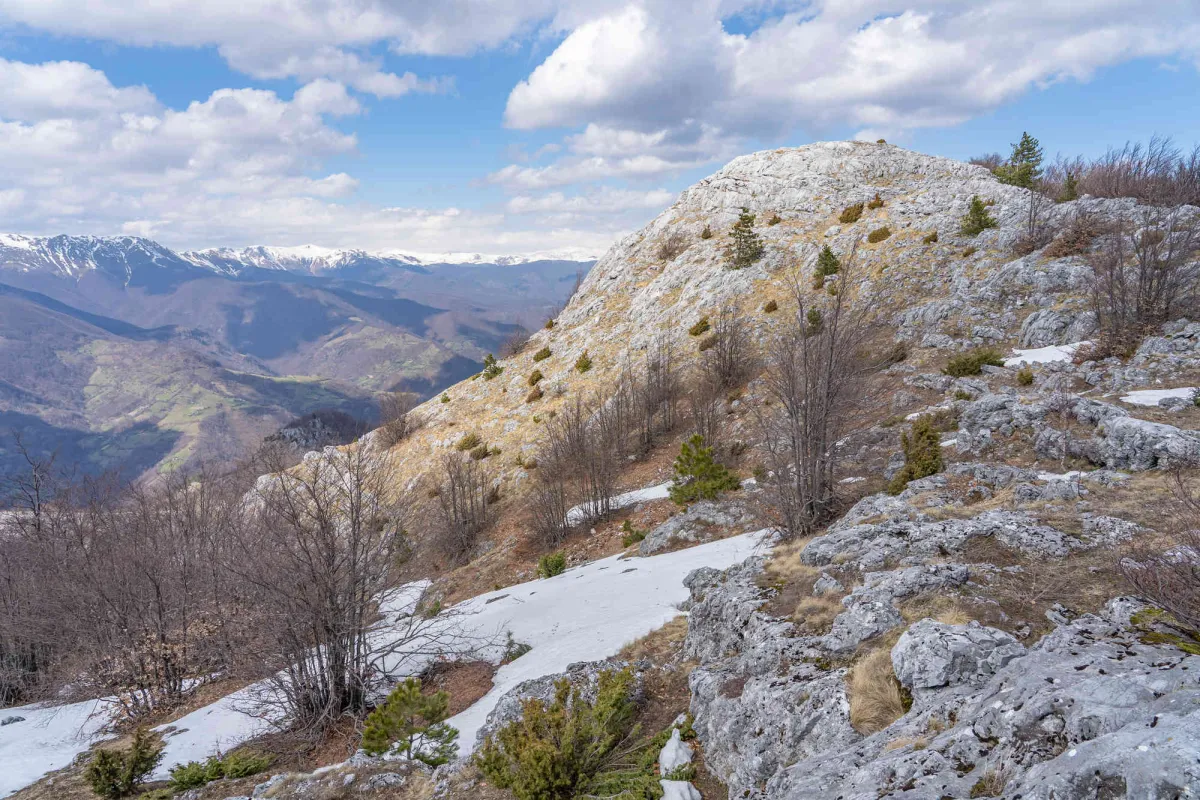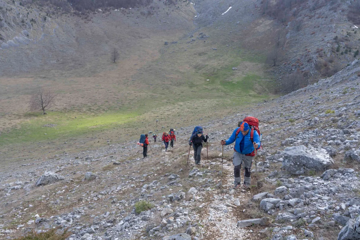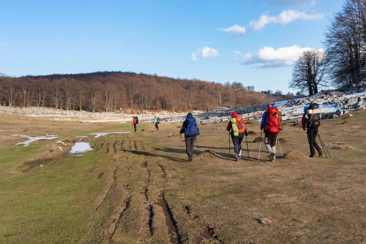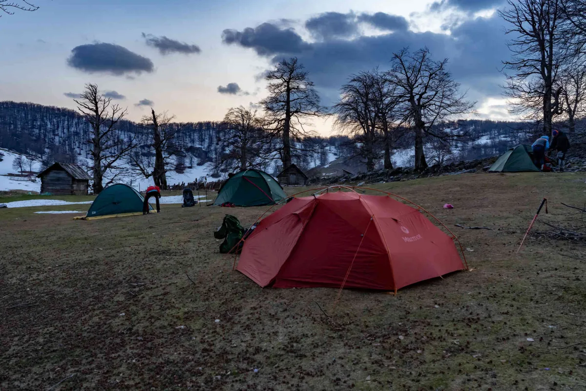 Ieșim apoi în Poiana Țăsnei de unde ne aprovizionăm cu apă pentru perioada rămasă, întrucât nu le recomand colegilor să apelăm la puțul din Crovul Medved. Din poiana Țăsnei cotim la stânga și urmăm traseul marcat BR, traseul cel mai abordabil cu bagaje mari care ne urcă în culmea Coștegului. Le prezint colegilor încă două alternative faine nemarcate de a urca în culme, pe care le vom aborda la o tură viitoare, majoritatea colegilor de tură nefiind familiarizați cu zona. Odată ajunși în cume suntem surprinși de un vânt turbat care avea o viteză de circa 50 km/h, mult peste cei 27 km/h care îi văzusem în prognoza meteo. În culme peisajul se schimbă radical, la o altitudine de peste 1000 m încep să apară petece de zăpadă pe versanți nordici iar temperatura resimțită era în zona de 5-10 grade. Peisajul în schimb era din ce în ce mai cuceritor, începeam să zărim Vf Pierele Albe și Poiana Ploștina în timp ce simt nerăbdarea colegilor pentru întâlnirea cu crovurile superioare ale Mehedinților. După pauza de masă ajungem pe Vf Pietrele Albe de unde vedeam crovurile ca-n palmă, începând cu Ploștinioarele aflate chiar lângă noi. Crovurile reprezintă cea mai cunoscută parte din relieful Mehedinților, un fenomen carstic incredibil care ne-a fascinat din nou în a prima zi din tura noastră. Am parcurs pe rând înșiruirea de crovuri prin fundul acestora, admirand dinții de calcar din partea stângă și culmile din dreapta presărate la bază cu lapiezuri. Trecem pe rând prin Crovul Medved, Poienile Porcului, Crovul Mare, Poiana Mare iar apoi urcăm în Poiana Beletina. Aceasta din urmă te surprinde de fiecare dată, la fel ca și celelalte crovuri, cu un peisaj nepământesc, impresia trăită prin acele locuri este aceea că te afli pe altă planetă! Poiana Beletina o găsim inedită, o combinație de verdeață, zăpadă și lapiezuri care te îmbie a ramâne locului. În tot acest timp vântul nebun nu ne slăbea astfel că începem negocierile pentru locul de înoptare întrucât ne apropiam de izvorul de la care urma să ne aprovizionăm cu apă pentru cină și pentru prima parte a zilei următoare. Planul inițial era să urcăm din nou în culme, mai exact la capătul Culmii Mazdronea unde aveam să găsim Poaina Sănunilor, aproape de Vf Lui Stan, la vreo 1,5 ore de mers. Deși am fost bine echipați, îmbrăcăminte sport de calitate din lână MERINITO, polare și membrane rezistente la vânt, vântul turbat a câștigat, nu ne punem cu natura, alegem liniștea unui loc dosit într-un apendic al Poienii Beletine și renunțăm la apusul de pe Vf Lui Stan și răsăritul din culme. Ne plimbăm prin cotloanele Poienii Beletine în căutarea unor locuri ferite de vânt și în cele din urmă alegem un loc fain în care scăpăm de vântuială și ne petrecem o seară liniștită, printre brândușele crescute de sub zăpezile proaspăt topite, la 1.231 m altitudine. În această primă zi aveam să parcurgem 17,5 km cu o diferența de nivel pozitivă de 2.077 m, suficient!