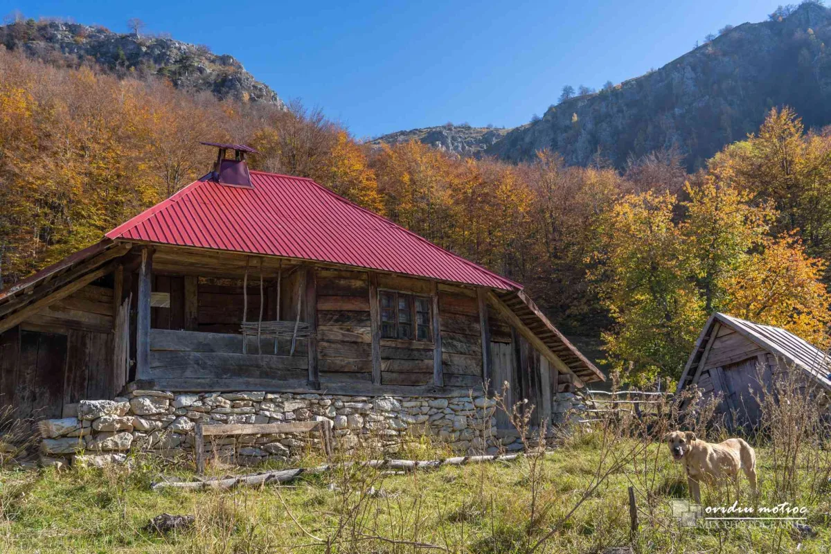 Prima zi, vineri, era cea mai “aventuroasă” din cele trei planificate, incursiune prin zone nemarcate pe sub abruptul Mehedințean printr-o înșiruire de poieni ascunse prin pădurile de foioase de la baza pereților verticali, apoi în partea finală geanțurile și ascensiunea pe o creastă antrenantă care cere efort, atenție și concentrare în pasajele expuse. Prima destinație a fost Poaiana Medved, după o ascensiune solicitantă, acolo aveam să găsim primele două conace. De acolo continuăm spre NE, aveam să ne continuăm urcușul până la o altitudine de peste 700 m unde mai găsim câteva conace. Urmează apoi doua crovuri largi, crovul Dealul Poienii în care găsim două conace apoi crovul Vintilani, locuit permanent de o familie cu un copil. Continuăm apoi prin poienile de sub Cheile Tâmnei după care urmează un nou urcuș mai susținut urmat de coborârea în Poiana Diconi, unde facem un popas la stâna din crov. Aici întâlneam ultima sursă certă de apă așa că ne alimentăm cu apă pentru seară, urma să dormim în creastă pe culmea Mazdronea, apa fiind puțină în zonele de carst cu creste calcaroase. După Diconi urmează Poaina Ursica în care admiram frumosul pinten de calcar apoi prindem curba de nivel prin pădurea de fag fain colorată până în zona Geanțului Țăranului iar apoi Geanțul Bobotului. Ne apropiem de ele, nu le vizităm sau escaladăm întrucât aveam alte planuri. De la Bobot continuăm iar în circa 30 de minute ajungem la baza superbei creste care urcă direct spre Vârful lui Stan. Parcurgem acea creastă, iar odata cu ascensiunea se deschideau vederi din ce în ce mai ample. Prima parte a crestei se parcurge matematic iar a doua parte necesită multă atenție, își fac apariția câteva pasaje expuse, acolo se ocolesc câteva porțiuni verticale pe o parte sau alta a crestei.