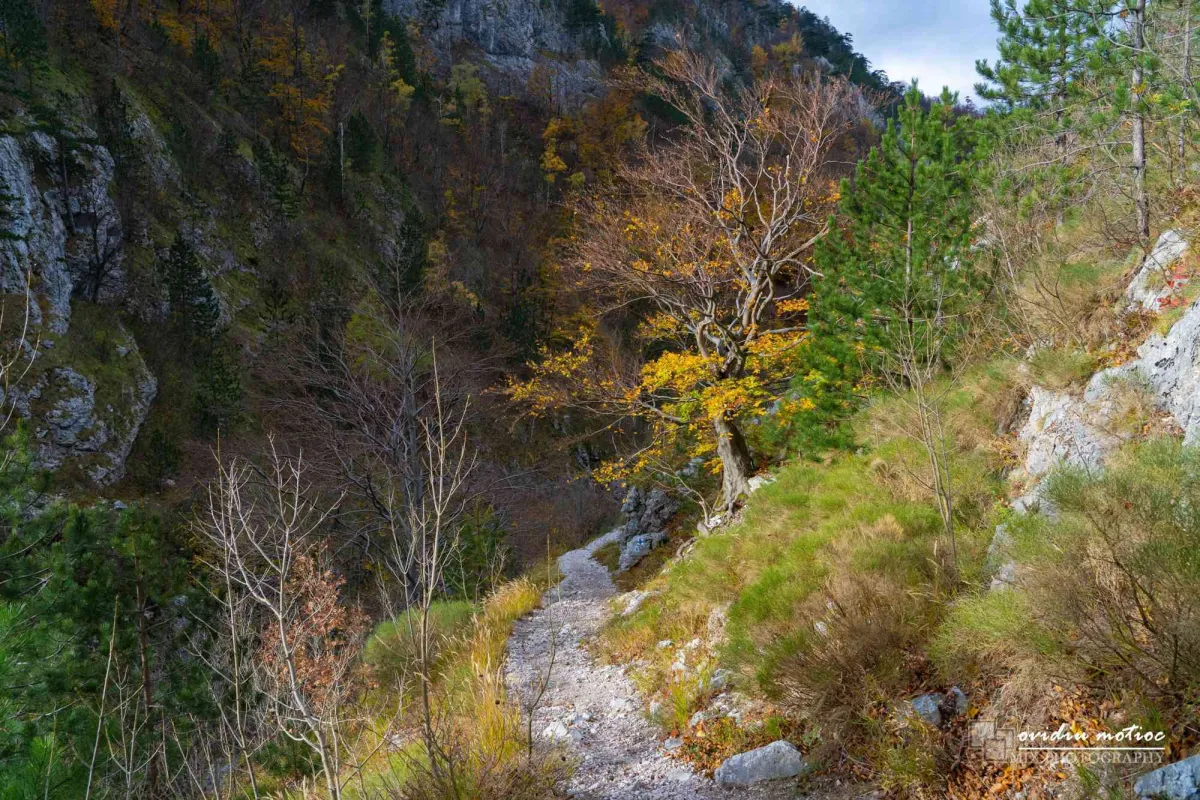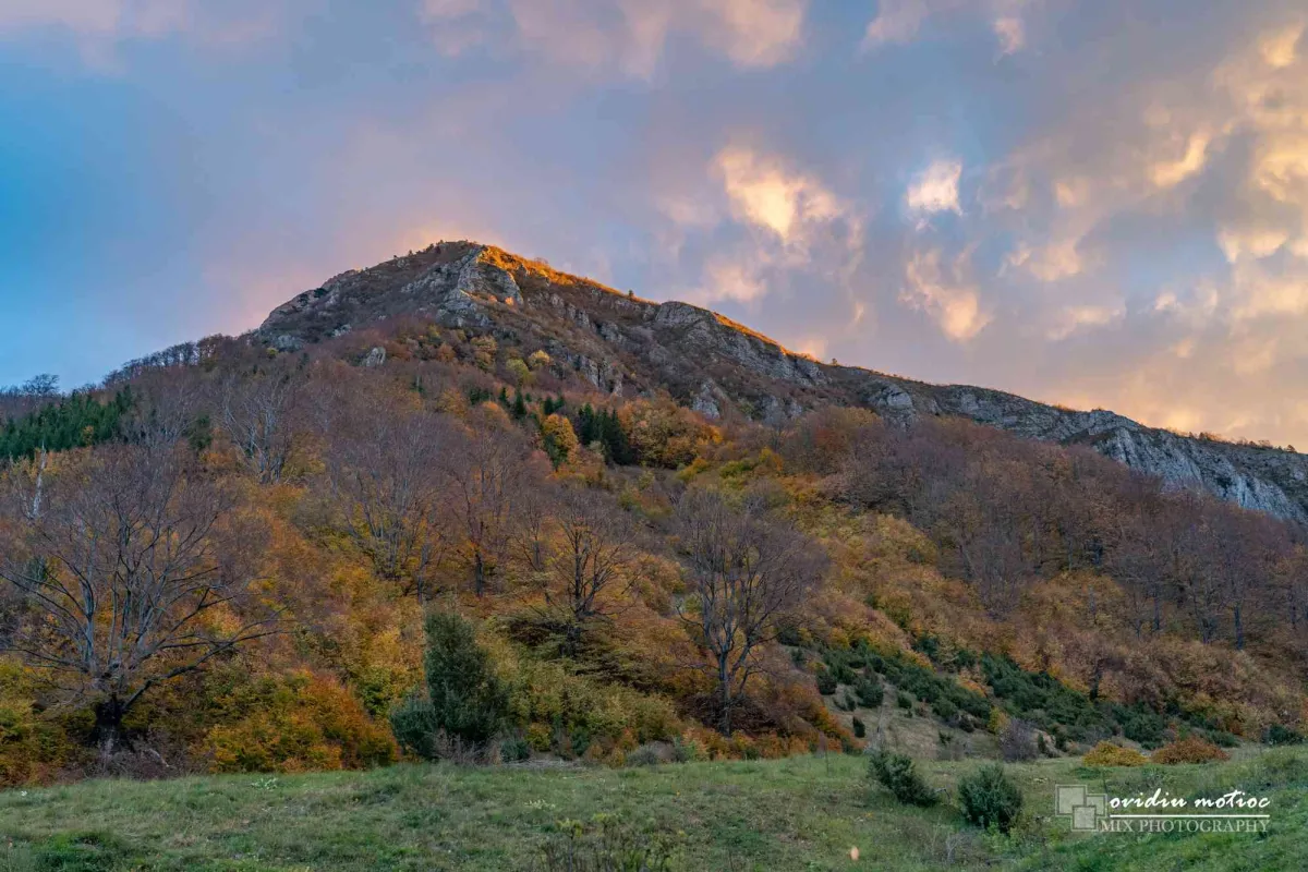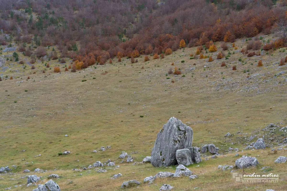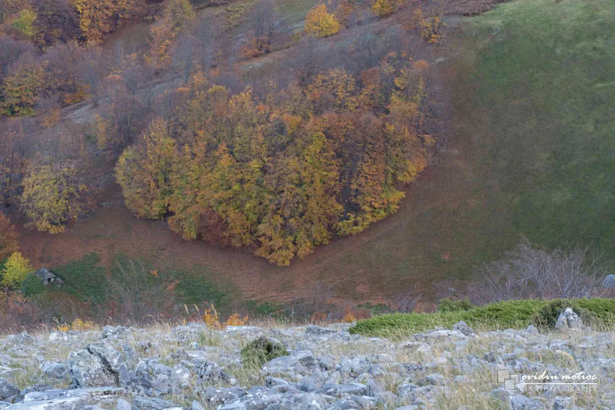 Ziua următoare, sâmbătă, aveam planificat în debut pozat de răsărit cu panoramă din Culmea Mazdronea. Nu a fost o tură cu noroc din punct de vedere al cadrelor foto, deși eram în locul ideal am prins o dimineață încărcată cu nori, fără culoare, așa că ne-am bucurat doar ochii și sufletele, cadrele foto colorate pe Vf lui Stan și Culmea Mazdronea mai au de așteptat o noua tura pe acolo. În general am fost puțin antilumină în tura asta iar cadrele foto rezultate sunt mult sub potențialul peisajelor. Urmează apoi o parcurgere clasică, pe marcaje, a crovurilor superioare ale Mehedinților. Alimentam cu apă în Poaina Beletina apoi luam la rând crovurile dinspre NE spre SV. Găsim un peisaj ireal de frumos, înșiruirea de doline în care predomină geanțurile care le marginesc, lapiezuri și păduri de fag. Aici avem un microclimat specific, frunzele fagilor din crovuri sunt mai grăbite cu 2-3 săptămâni față de cele ale pădurilor din zonă, cum mă așteptam găsim zona crovurilor ruginie cu un aspect de noiembrie. Pentru a prinde crovurile colorate în galben-maroniu ar trebui planificată o tură mai timpurie când pădurile din zona sunt încă verzi. După ascensiunea pe Vf. Pietrele Albe coborâm pe marcaj PG în Poiana Țăsnei, loc în care aveam planificată tabăra pentru urmatoarea noapte. Știam că o vom găsi colorată la apogeu însă erupția de culoare de la asfințit ne lasă “mască”, am avut parte de un spectacol unic de lumină și culoare. Am fost inspirați cu alegea locului de cort mai dosită pentru acea noapte, au fost vânturi extreme în crestele Mehedinților în acea noapte.