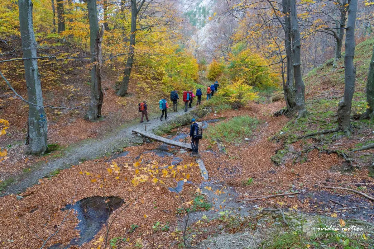 Zilele de toamnă colorate sunt scurte așa că am dedicat trei zile pentru această întâlnire. Ne-am adunat un grup de 11 membri ai CAR Cluj și o simpatizantă din Craiova. Locul de întâlnire a fost într-o poieniță pe Valea Cernei aproape de Puntea lui Stoian, locul în care începea și se încheia tura noastră în circuit. Am ajuns de joi pentru a putea pleca la prima oră așa că vineri începem ascensiunea cu corturile de la Puntea lui Stoian.