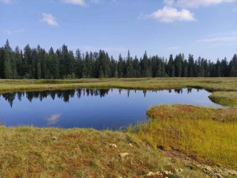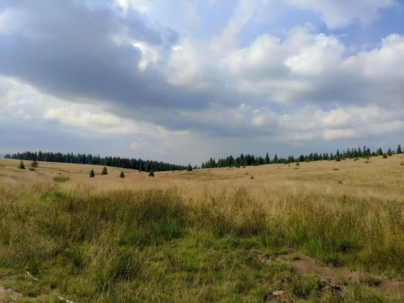 În data de 19 august am pornit cu mașina Ioana M, Gabriel O şi subsemnatul, spre Valea Somesului Rece, urmând ca, din punctul intersecţiei drumului de vale cu drumul asfaltat spre Măguri, să începem tura, care ne va urca în golul alpin şi ne va conduce în superbe poieni, ascunzând mici lăculeţe și zone de apa meandrată, numite molhasuri sau tinoave, având caracter de rezervație naturală. Traseul nostru urcă pe Valea Somesului Rece, până la intersecţia cu Valea Irisoara, pe care o vom urca, trecând pe lângă grupul de case omonim și un canton silvic, pentru a ajunge în şaua Tina Bogdanului. După o şedinţă de trail-side fixes, coborâm spre Cantonul Bogdanu şi urcăm spre Vârful Piatra Groşilor (1757 m), bucurându-ne de afinele de pe drum. Odată ajunşi în golul alpin, ocolim pe curba de nivel vârful, admirăm priveliştile spre Muntele Mare, Valea Arieseului şi creastă principală pe care o vom străbate, urmând marcajul banda roşie, şi ne angajăm într-o coborâre susţinută spre Poiana Stedea. Aici, la locul numit Crucea Bătrânei părăsim marcajul de creastă şi ne ghidăm după vechiul marcaj banda galbenă, care ajunge la Cantonul Bogdanu, iar mai departe la Dobrin şi Măguri-Răcătău. Noi însă îl vom urma doar câteva sute de metri, pentru ca apoi să îl părăsim şi să pătrundem într-o poiană, unde găsim Molhasul de la Piatra Calului (denumit informal Molhasul lui Arnold). Doresc să îi aduc mulţumiri domnului Dinu Mititeanu, care m-a informat despre existenţa acestui molhaş deosebit şi mi-a oferit datele necesare şi încurajările, pentru a ajunge la el. Zonele de apă meandrate împreună cu muşchiul umed creează un peisaj deosebit, parcă aparţinând altei lumi. Oferta de afine este bogată, dar încă nu am ajuns la jumătatea turei şi, astfel, reluăm traseul de creastă, urcând în Poiana/Vârful Smidele (1644 m) şi coborând la Poiana Căpăţâna. De la acest nivel ne îndreptăm spre Rezervația Molhasurile Căpăţânii. Comparativ cu Molhasul de la Piatra Calului, acestea prezintă nişte lacuri mai mari şi o colonie mai bogată de Rouă Cerului (Drosera rotundifolia), planta insectivoră endemică, protejate într-o poiană înconjurată de brazi. Apreciem liniştea, aerul curat şi peisajul şi ne continuăm drumul, care ne va purta pe Vârful Balomireasa (1632 m), oferind o perspectivă spectaculoasă atât spre Valea Ariesului, cât şi spre culmea Muntele Mare-Piatra Groşilor, de unde venim. Deoarece ziua se apropie de final, ne angajăm pe ultima (şi cea mai lungă) coborâre a zilei de astăzi, pe sub coliele Zbrou, Letoase, Munțisoru, până la Blajoaia. Urmăm mai departe drumul forestier, de pe Valea Somesului Rece, fotografiind apusul la grupul de colibe Damis, având în fundal Vârful (1670 m). Parcurgem ultima parte a drumului forestier pe întuneric, la lumina farurilor, incheiind în mod frumos şi memorabil o tură complexă în masivul Muntele Mare. Doresc să mai aduc mulţumiri lui Gabriel O, pentru organizarea logistică, precum şi lui Calin N şi Sanda R, cu care am realizat o recunoaştere prealabilă la Mohasul de la Piatra Calului, tură din care voi ataşa, de asemenea, câteva poze.