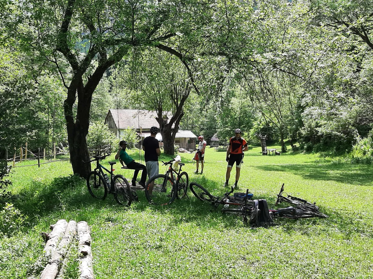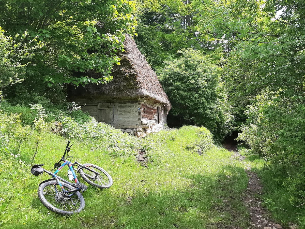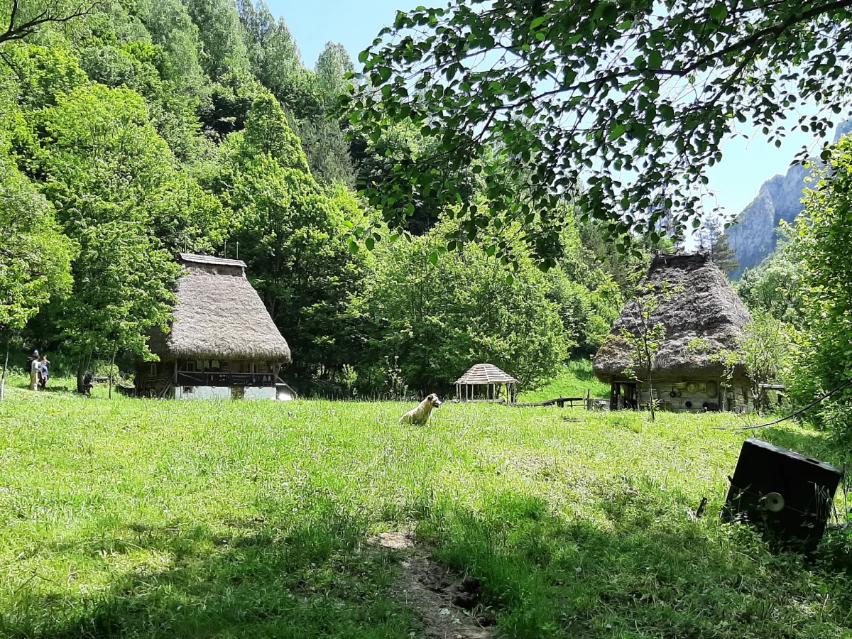 Trecem pe langa cele cateva case ce alcatuiesc catunul (pe langa case si adaposturi pentru animale (grajduri) parasite si aflate in paragina, am intalnit si case traditionale reconstruite) si ajungem intr-o poiana inierbata langa care se afla o casa locuita si o troita.