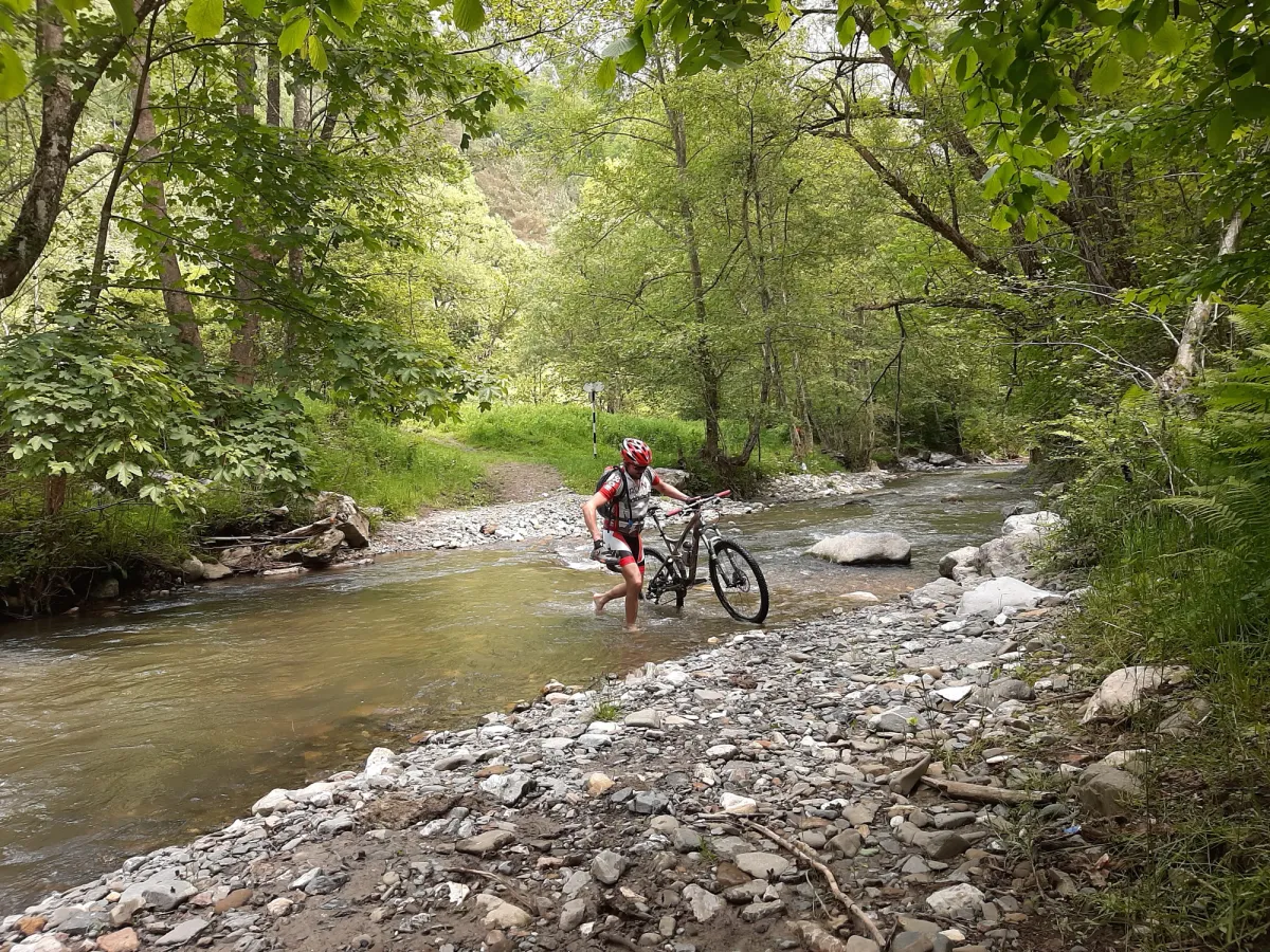 Dupa ultima cabana de pe dreapta, la cateva sute de metri, drumul intra in padure, zona in care facem doua treceri prin apa.