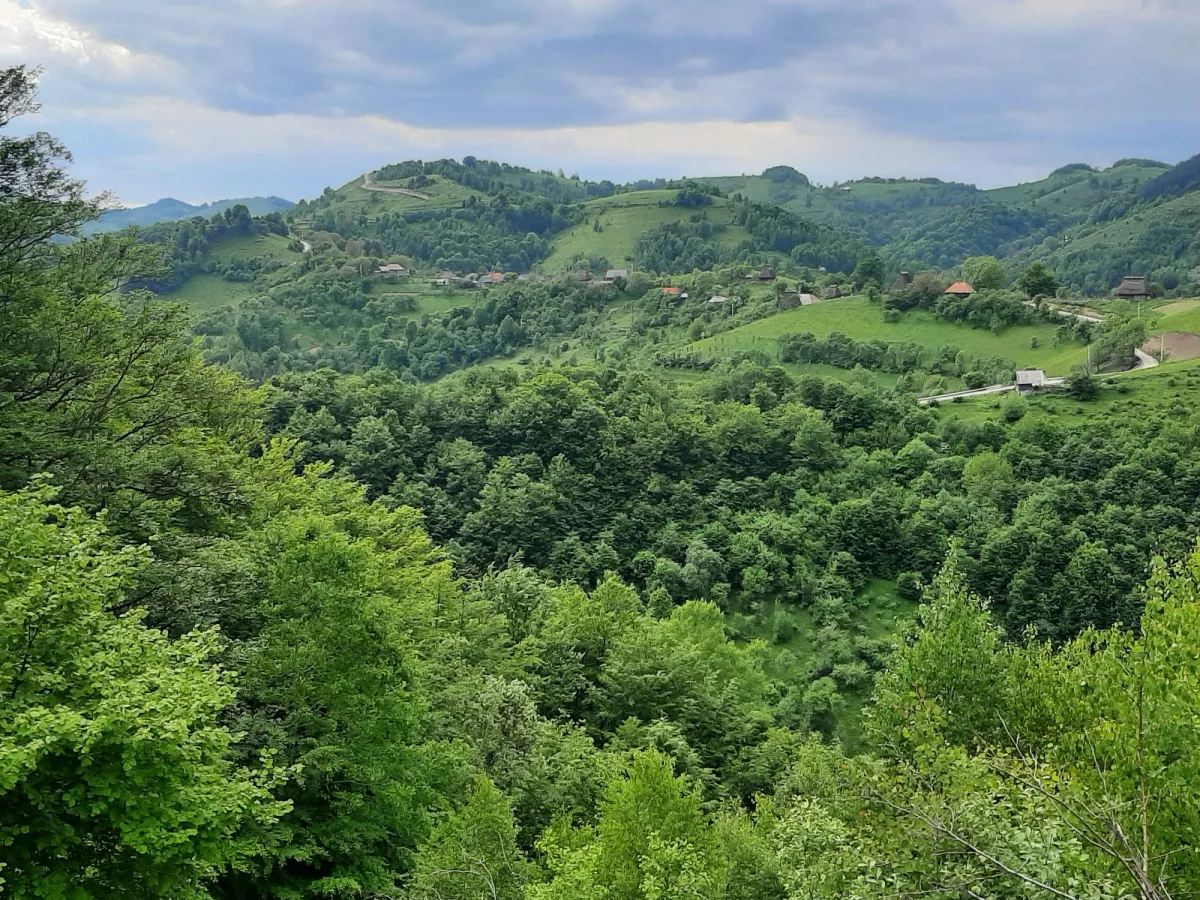 De pe Dealul Cacovei continuam coborarea spre schitul Cacova si apoi, prin padure, spre satul Livezile, iar de aici parcurgem o portiune de trei kilometri de asfalt pe DJ 107M pana in Poiana Aiudului.