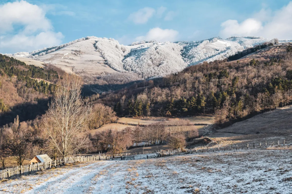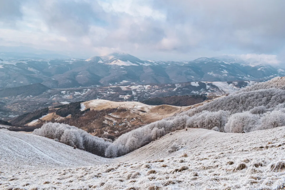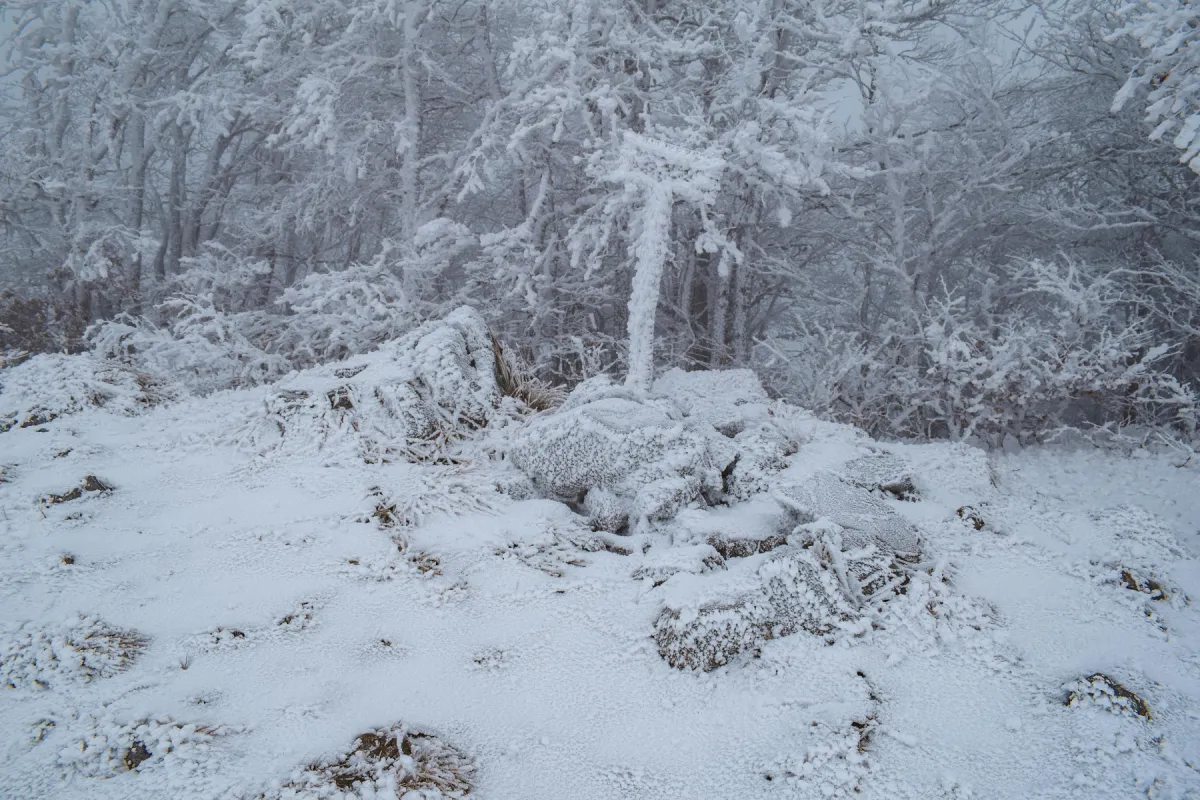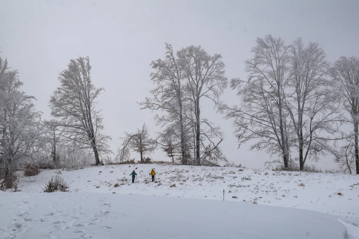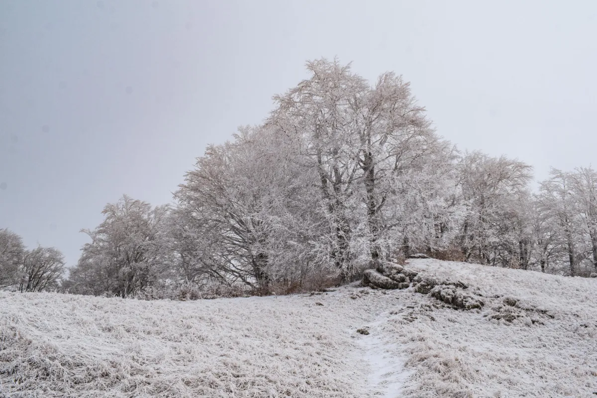 Pe măsură ce câștigăm altitudine, peisajul devine din ce în ce mai plin de alb, iar copacii cu ramurile încărcate de chiciură încep să fie în prim planul obiectivelor aparatelor de fotografiat.